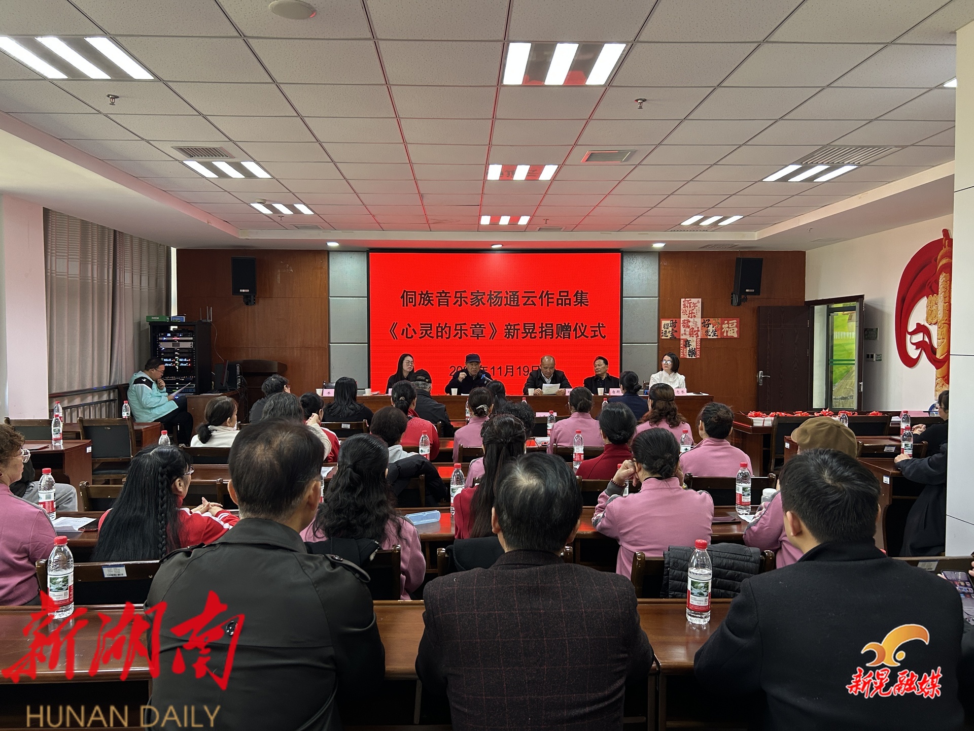 11月19日,侗族音乐家杨通云在县图书馆为我县多部门赠阅作品集《心灵的乐章》。