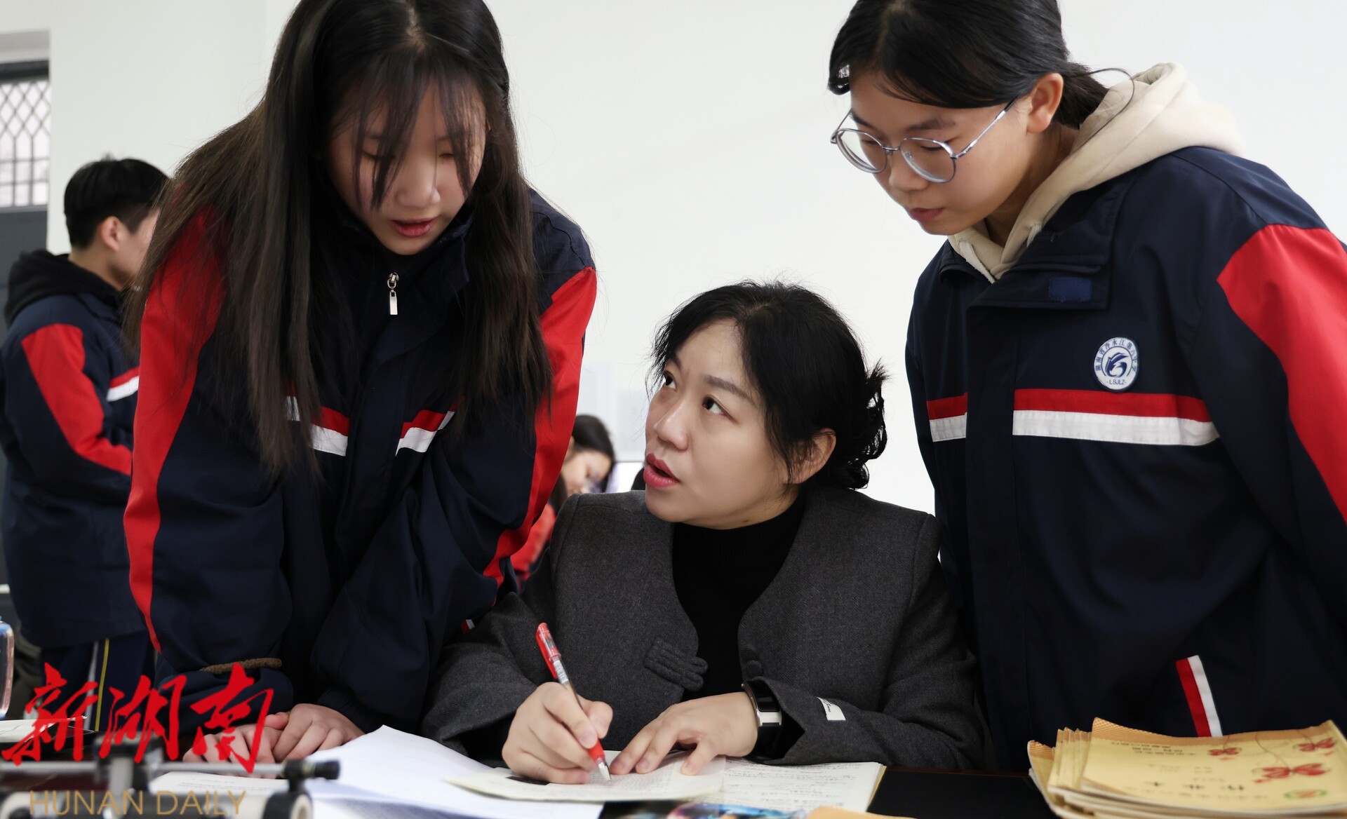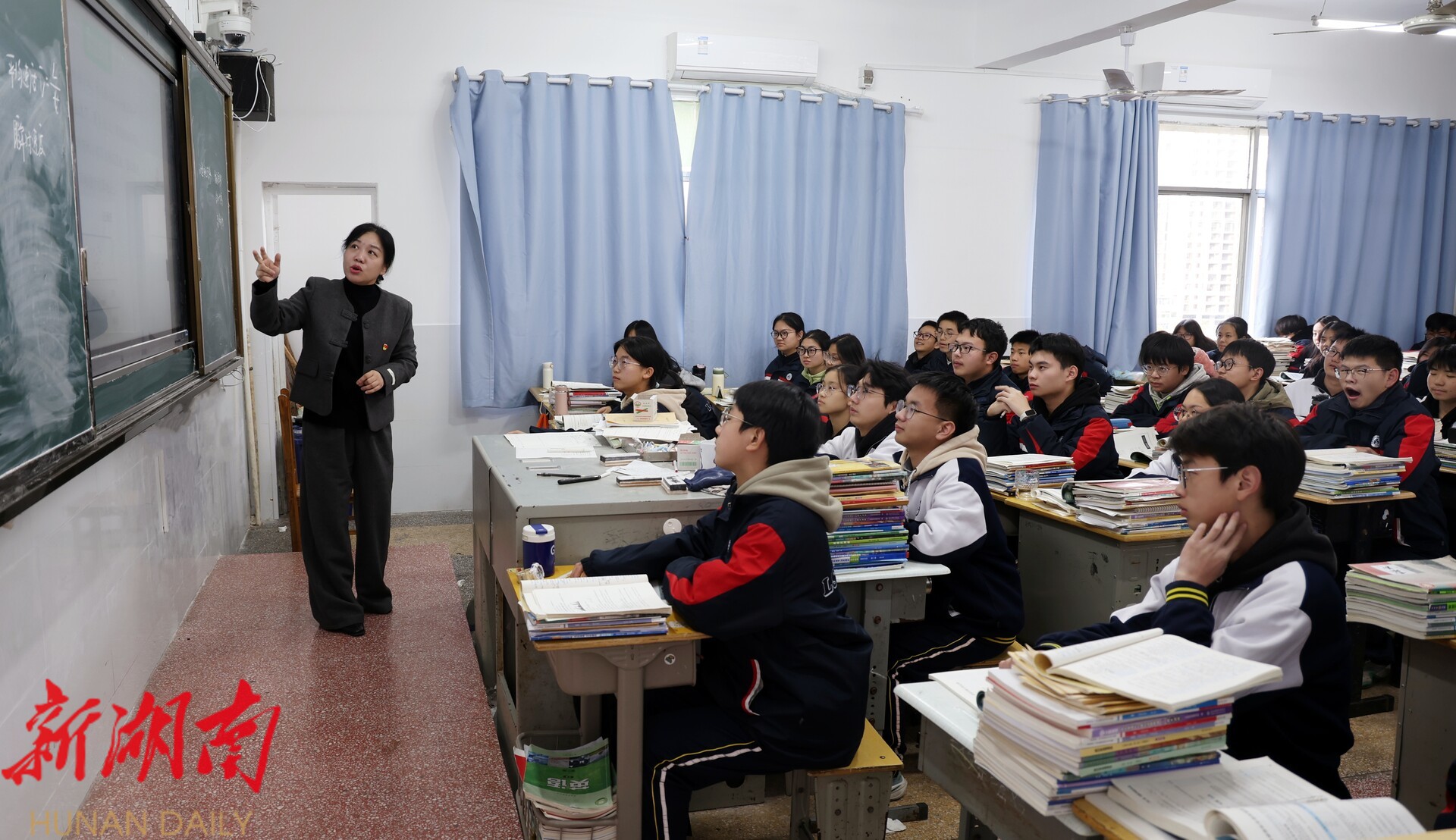 冷水江 市第六中学学生张金涛说:“李老师在上课的时候非常的严肃,但是在下课之后,我们去找她问问题,她会很温柔地跟我们讲解,直到我们懂了为止。”