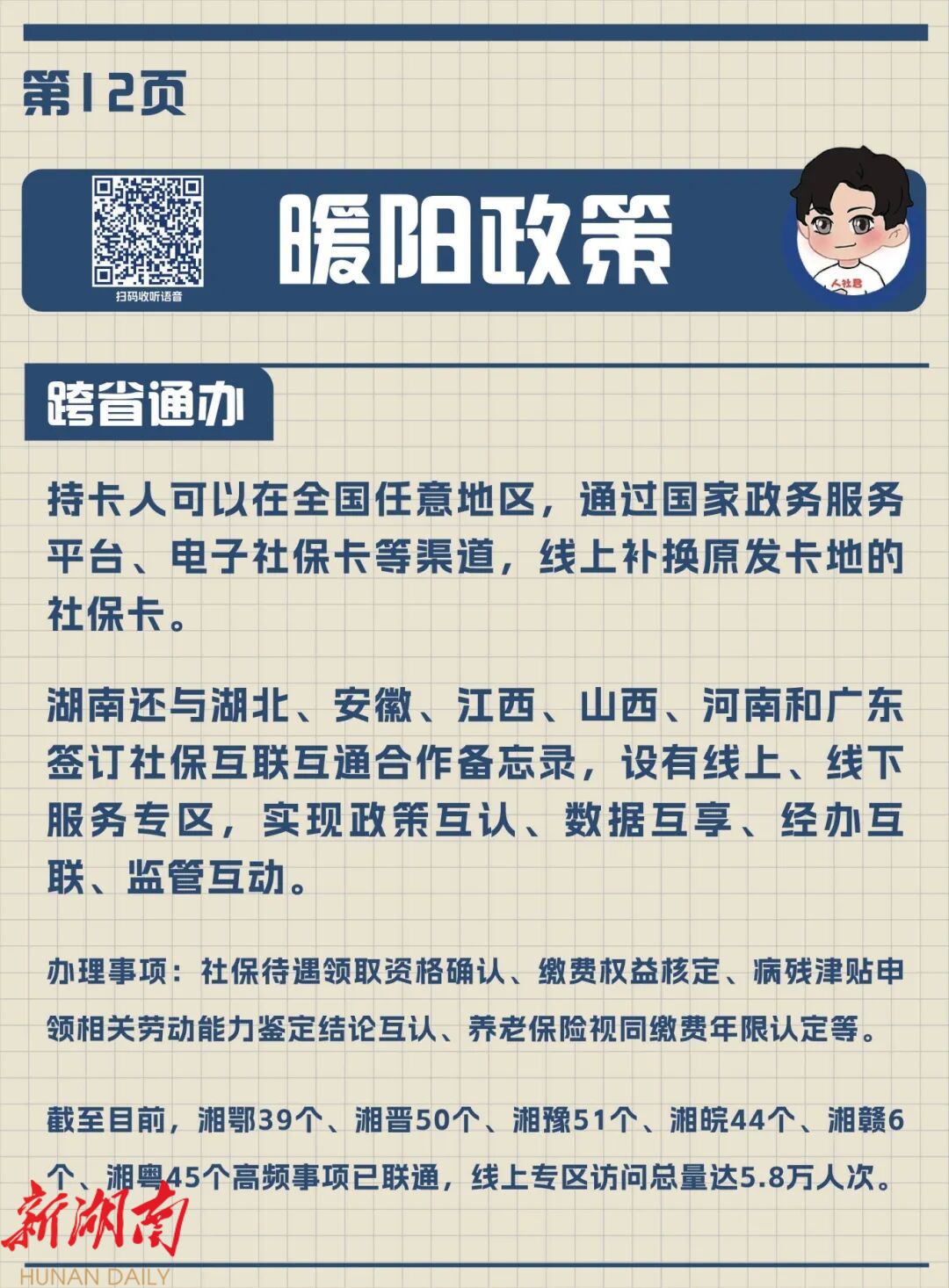 为推进更多事项跨省通办,近年来,湖南创新实施“中部六省+广东省”社保互联互通,与各省开设线上服务专区,收获显著成效。截至目前,湘鄂39个、湘晋50个、湘豫51个、湘皖44个、湘赣6个、湘粤45个社保服务事项互联互通,各省线上专区总访问人次超5.8万。