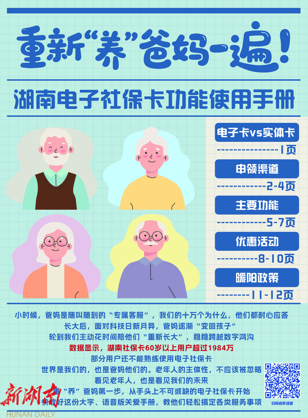 数据显示,湖南社保卡60岁以上老年用户超过1984万;签发电子社保卡4024.52万张,较“十四五”初期增长168.8%。这份看得见、听得懂、学得会的手册,是省人社厅面向他们创新推出的适老化举措,也是民生工作的温度体现,让发展成果惠及每一代人的生动实践。