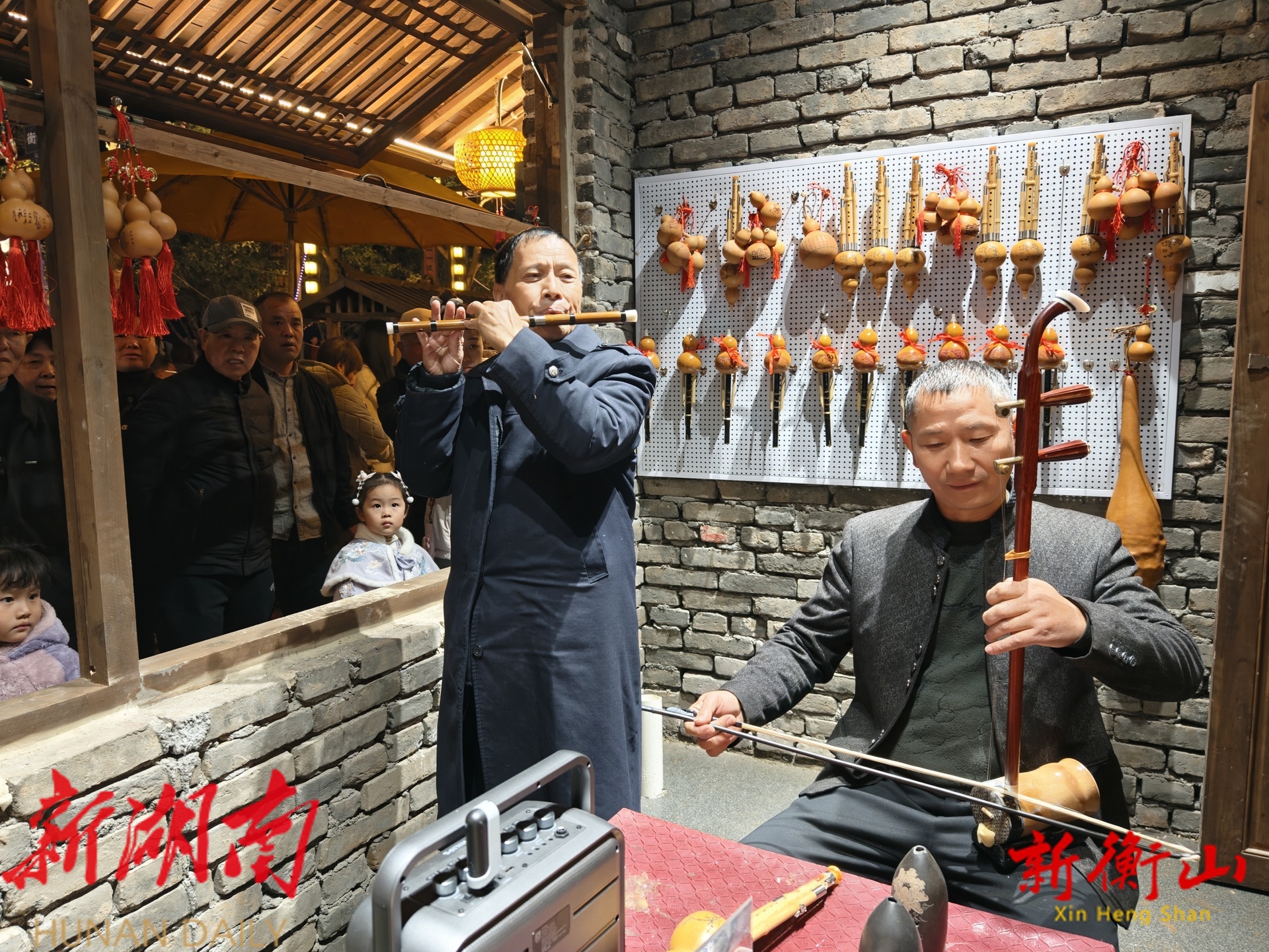 而在互动体验区,民俗乐器店同样热闹非凡。在传承人的耐心指导下,众多市民都饶有兴致地拿起乐器,尝试吹奏。其中“衡山音乐人”尹辉中更是拿出自己的“绝活”,根据吹奏韵律,即兴唱起了极具衡山本地特色的山歌。