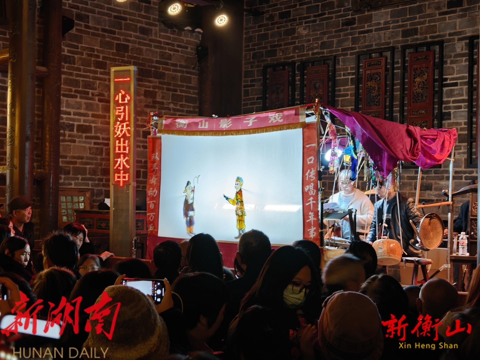 华灯初上,衡山渡街区已是人声鼎沸。最引人驻足的,当数街头的皮影戏表演区。白色幕布前被围得水泄不通,“里三层外三层”的市民纷纷踮脚围观。当经典的《三打白骨精》剧目开场,活灵活现的皮影打斗、诙谐生动的配音,立刻引发现场阵阵喝彩与掌声,古老的技艺在此刻焕发了全新的生命力。