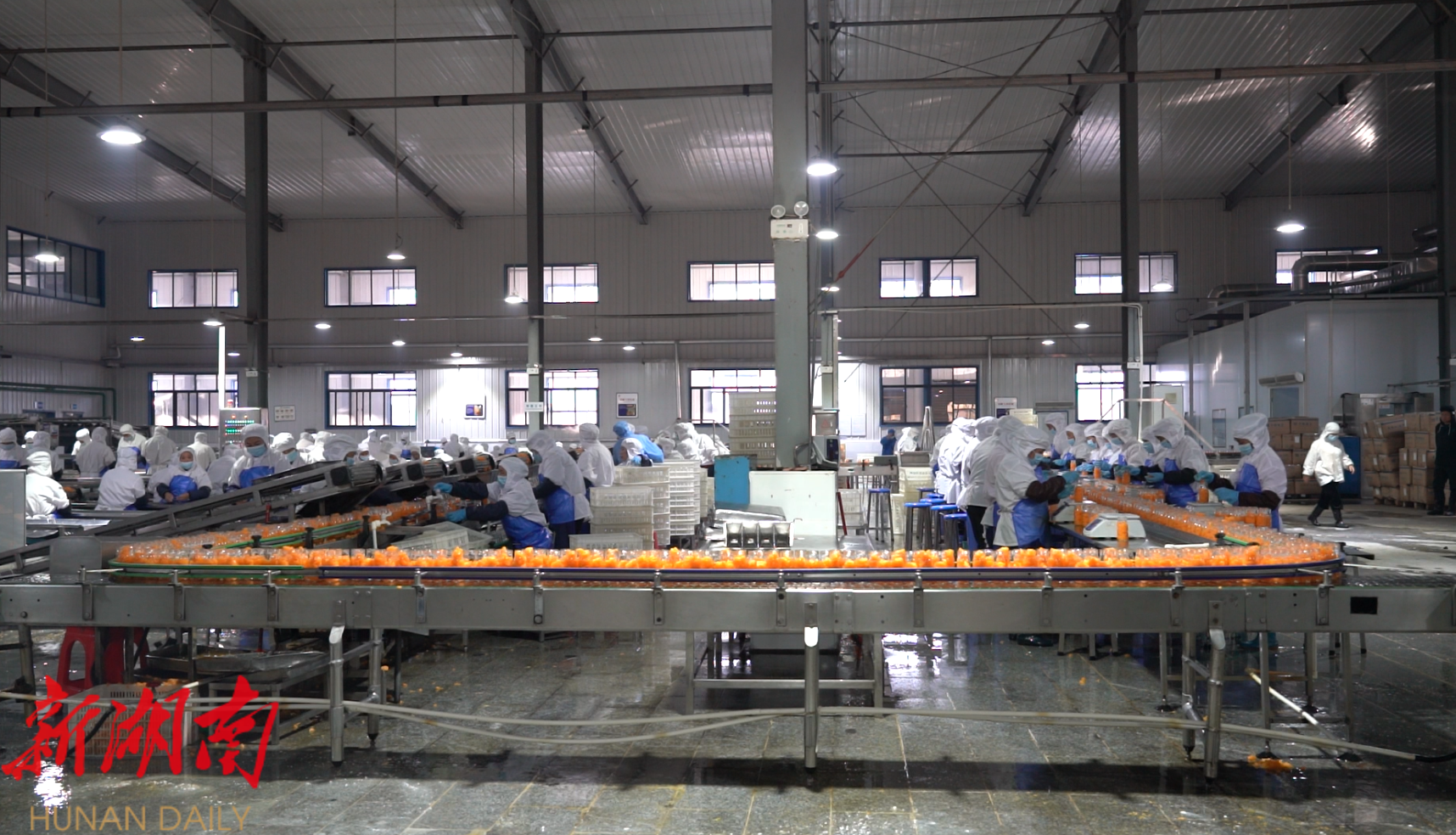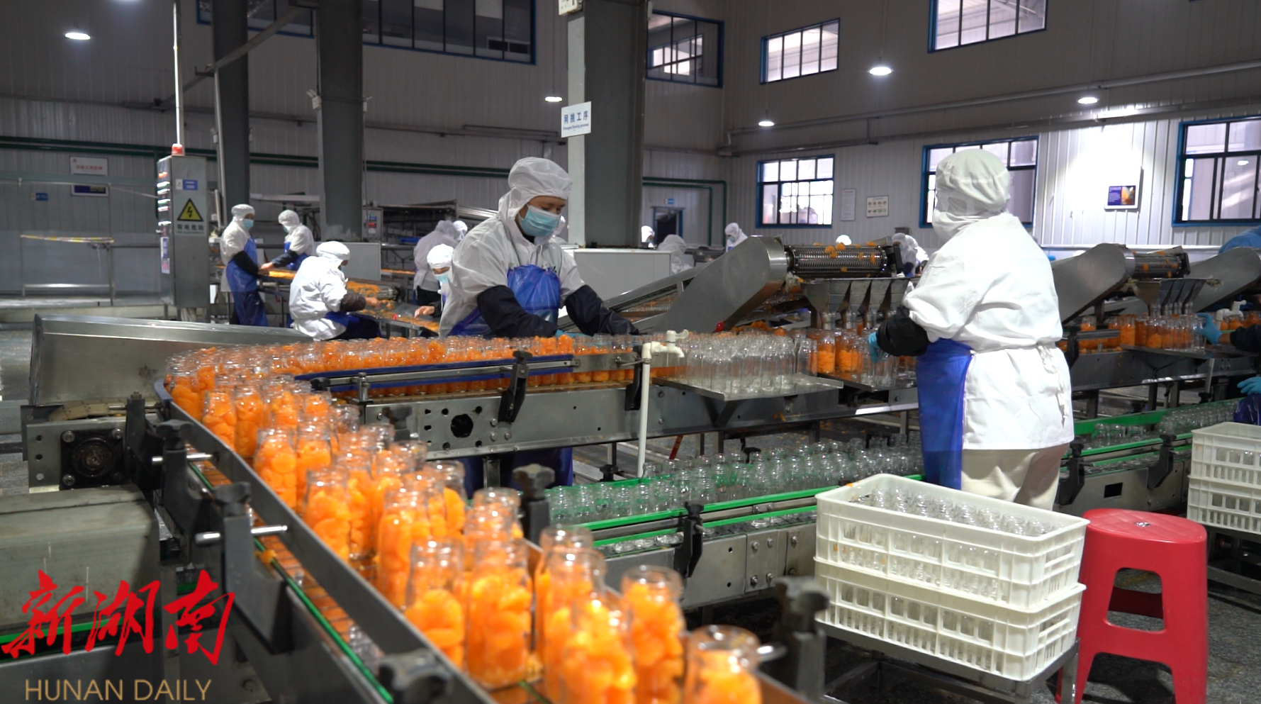 11月20日,记者来到位于怀化高新区的湖南海联食品有限责任公司生产车间内,只见工人们正加紧赶制春节前的订单。从中方县花桥镇千丘田当日采摘的新鲜柑桔,被迅速运至工厂,经过去皮、分瓣、筛选、装罐、封盖、打包等一系列工序,成为符合北方消费者偏好的水果罐头产品。