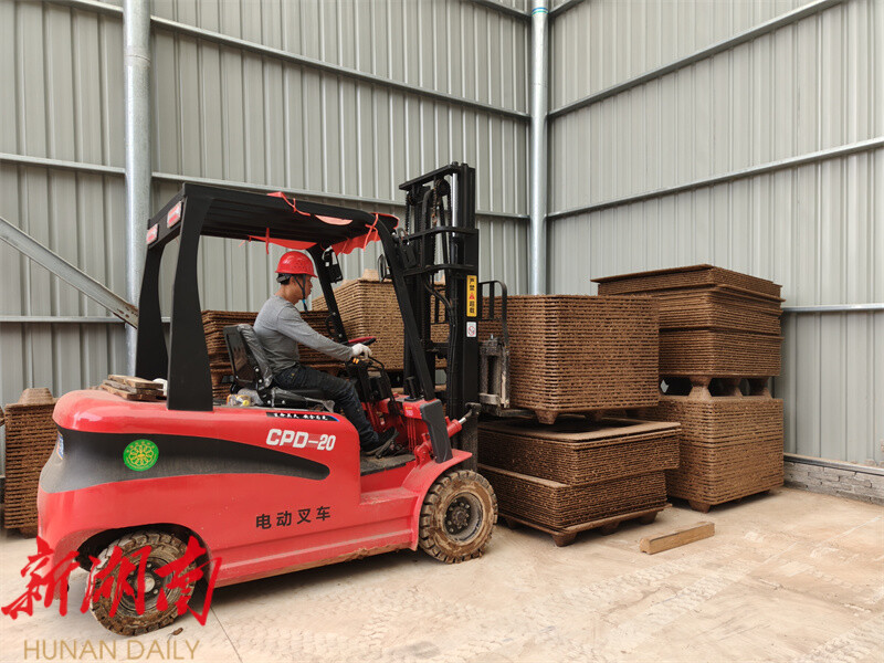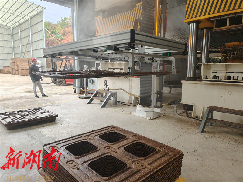 走进筻口镇的岳阳梓洋木业有限公司车间内,机器轰鸣作响,生产线正开足马力赶制一批发往中石化的订单。烘干粉碎后的水稻、玉米、大豆等农作物秸秆,经传送带送入储料仓,经过拌料配比、称重、高温高压成型等工序后,摇身一变化身为环保耐用的模压托盘,可广泛应用于物流运输、药品化工、电子电器等多个行业。
