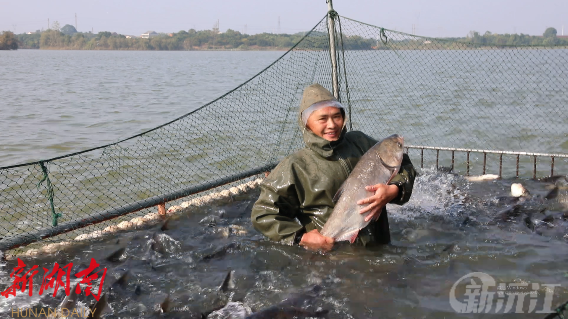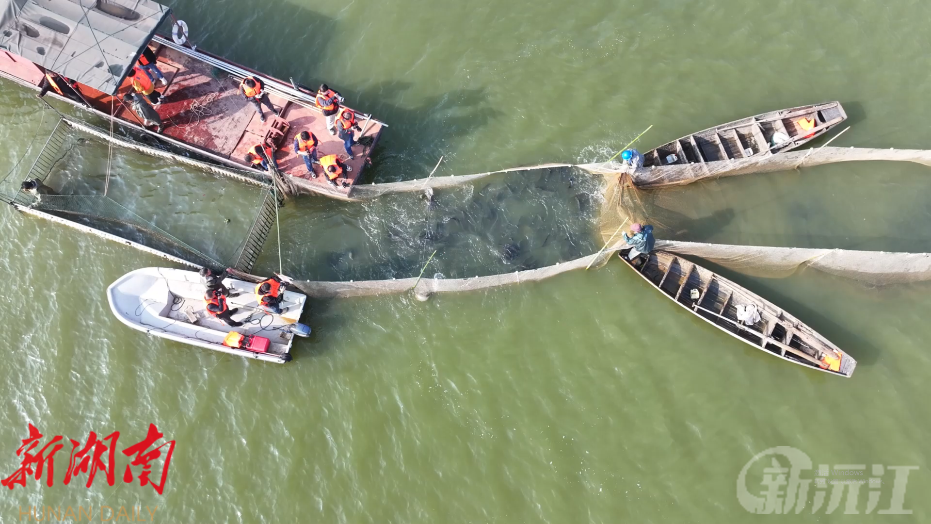 在浩江湖畔的湖中央,渔民驾驶的渔船缓缓靠近一处巨大的围网,船旁的渔排缓缓对近网口。围网两边的渔民轻轻一提,黑背的沅江大头鱼一时间就热闹起来,它们蹦跳而起,通过网口,一齐涌入到渔排当中,一会儿时间,渔排内就装下了上万斤沅江大头鱼。