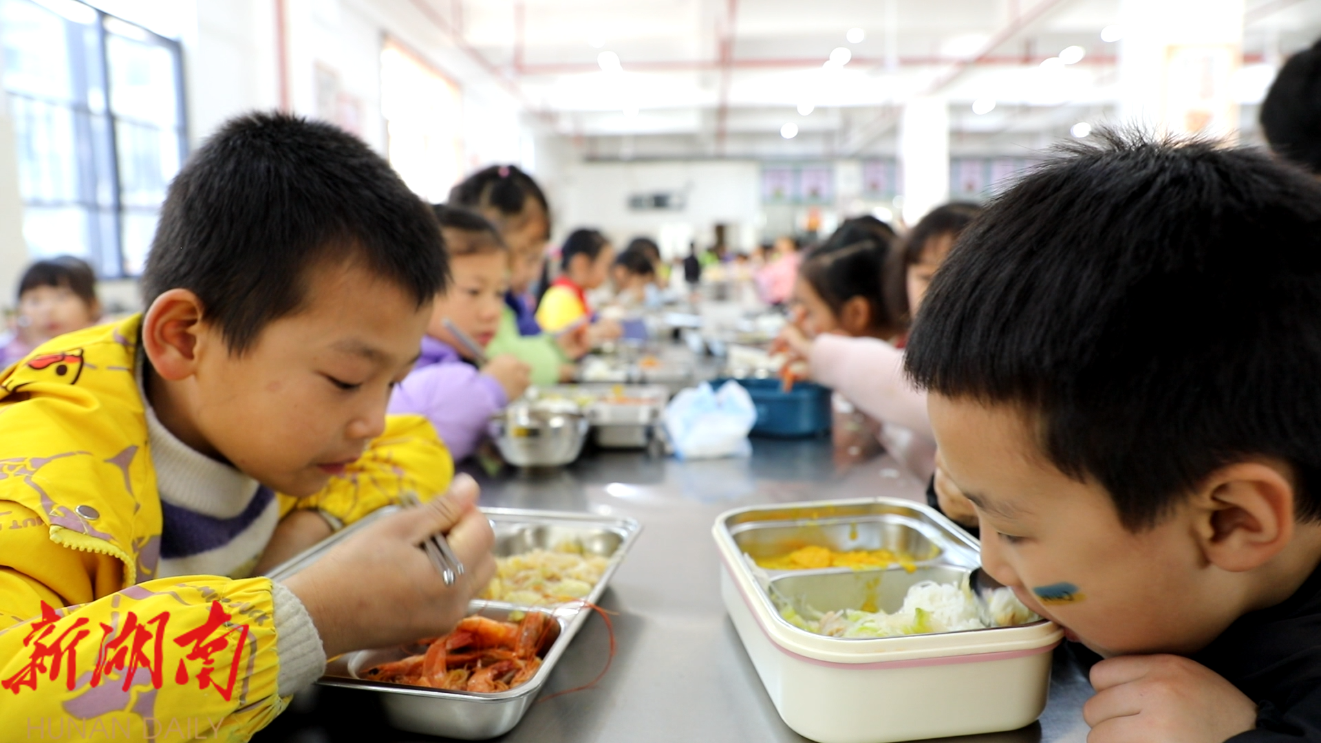 潇浦镇芙蓉学校家长王爱平说:“如今抬头就能在大屏里看到师傅洗菜、炒菜、分餐的全过程,干净卫生,我们看着踏实、放心!”