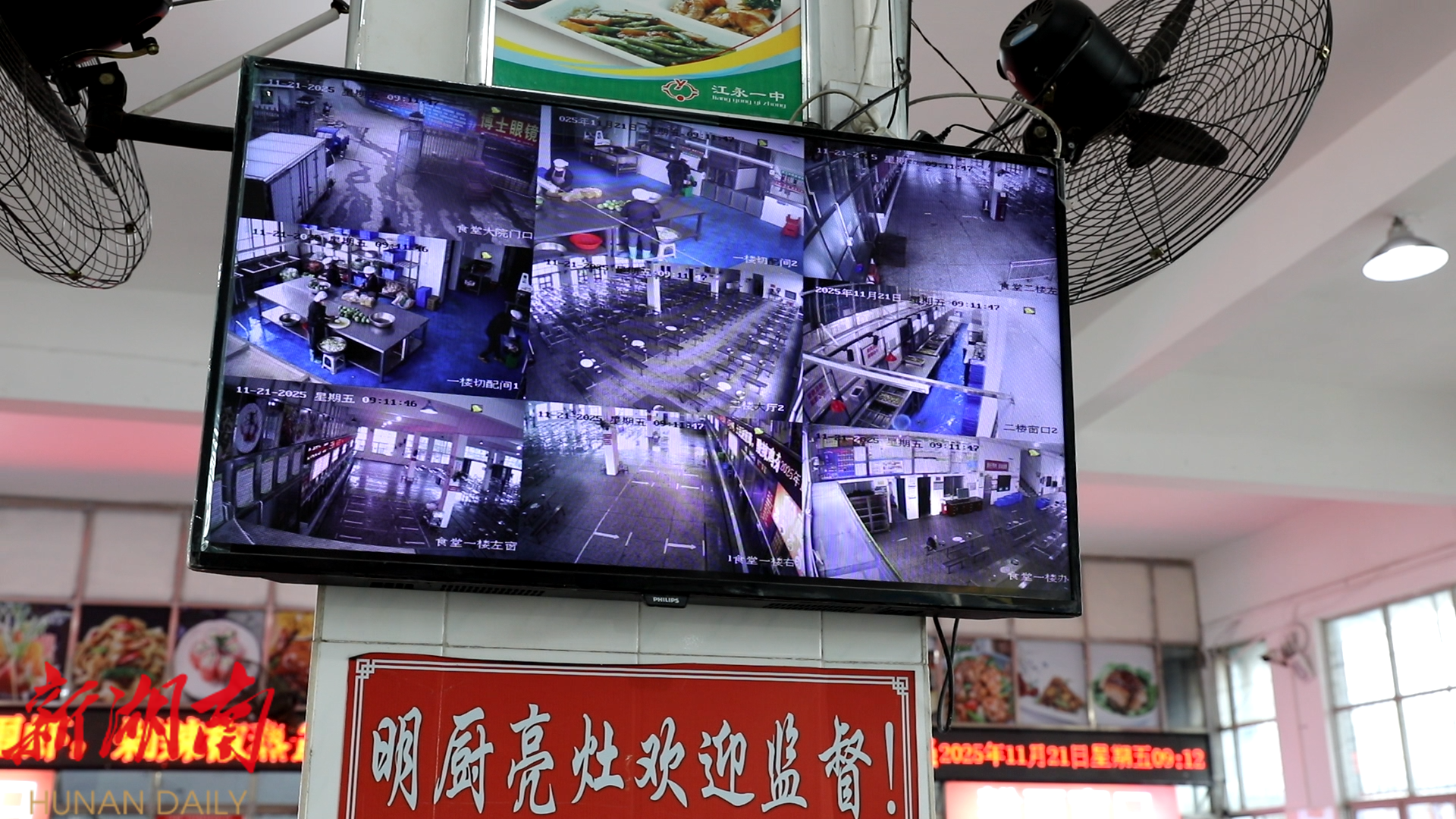 在江永县第一中学、潇浦镇芙蓉学校等中小学校可以看到,只需扫一眼就餐区的显示屏,就能将洗菜、切配、烹饪、清洗消毒等关键环节尽收眼底,执法人员在智慧监管中心即可实时巡查学校食堂后厨情况。