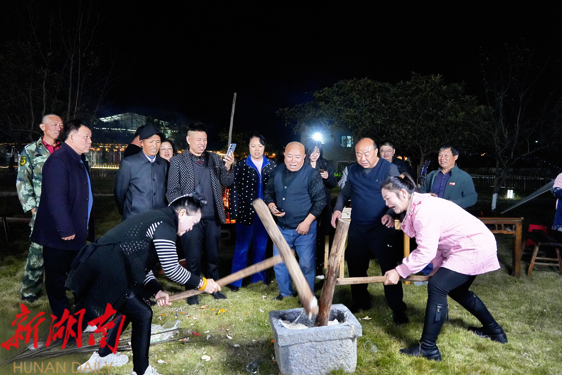 洞口融媒11月25日讯(记者:肖皓静) 11月24日晚,文昌街道平青村的望龙山庄度假区,木槌撞击石臼的声响此起彼伏,熊熊篝火照亮了村民们的笑脸。一场热闹非凡的乡村篝火晚会暨打糍粑活动举行,村民与游客齐聚一堂,体验民俗乐趣,共话丰收喜悦。