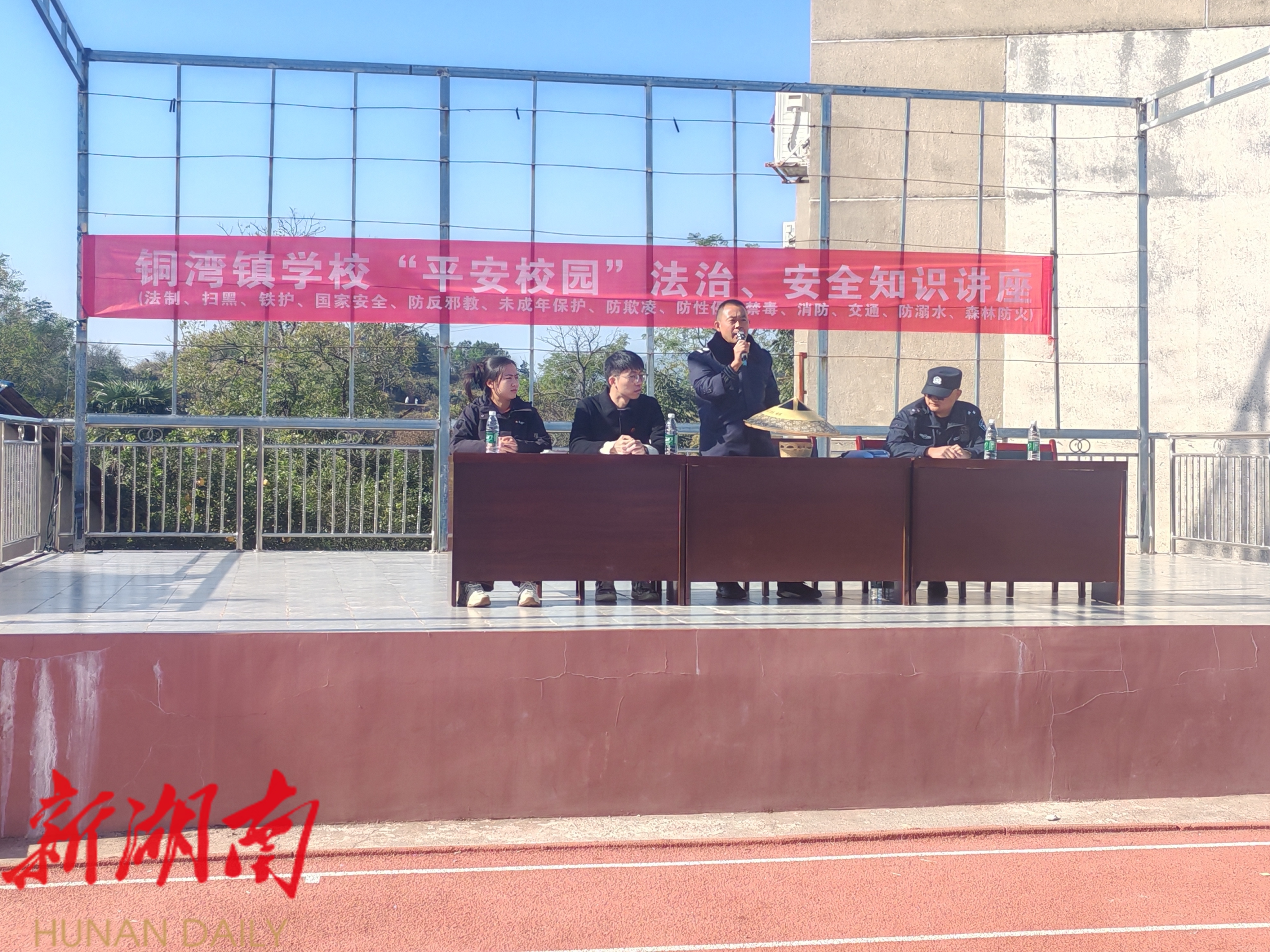 中方融媒11月25日讯 (通讯员:米湘)为进一步深化平安校园建设,切实增强广大师生的法治观念和安全防范意识,营造安全、和谐、健康的校园环境,11月25日上午,中方县铜湾镇司法所、派出所与县人民法院铜湾法庭携手联动,走进中方二中,为全校师生带来了一场内容丰富、意义深刻的校园安全综合宣讲活动。宣讲内容紧密围绕与青少年成长息息相关的热点问题,涵盖了未成年人保护、防范校园欺凌、扫黑除恶、禁毒、反邪教以及预防“帮信罪”等多个关键领域,为孩子们的健康成长保驾护航。