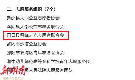 洞口融媒11月26日讯(记者:胡海鹏) 1 1月24日,中共邵阳市委社会工作部公示了2025年度邵阳市志愿服务之星宣传选树先进典型候选名单,“洞口县雪峰之光志愿者联合会”入选。