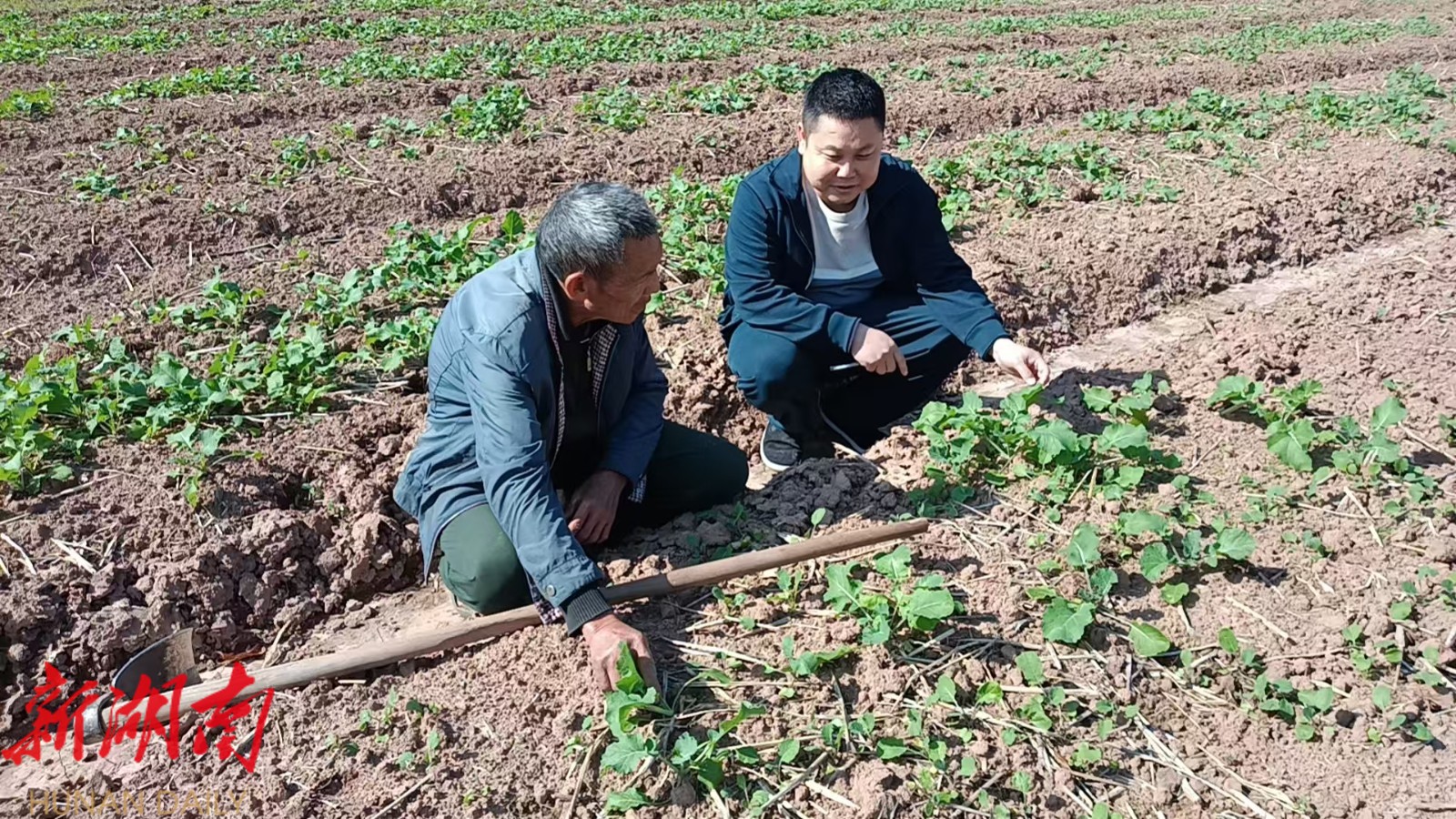 在松坡村,党员干部仔细查看了村民周自明家的油菜幼苗的长势情况,结合当前实际,用通俗易懂的语言,详细讲解了油菜移栽的株距、行距控制、定植深度、水分管理以及后续施肥、病虫害防治等关键技术要点,并亲自示范规范操作。