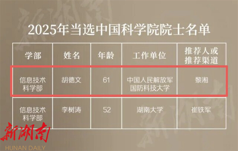 湖南日报·新湖南客户端11月26日讯(通讯员 周昱君) 近日,2025年两院院士增选结果揭晓。中国人民解放军国防科技大学教授胡德文当选中国科学院信息技术科学部院士。