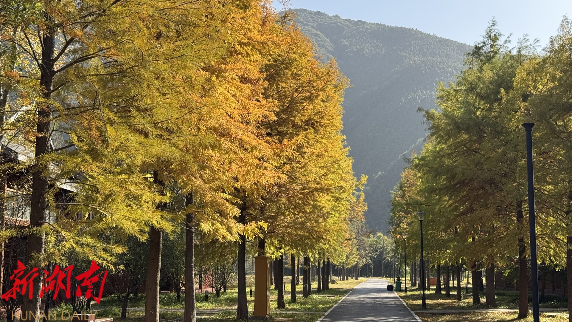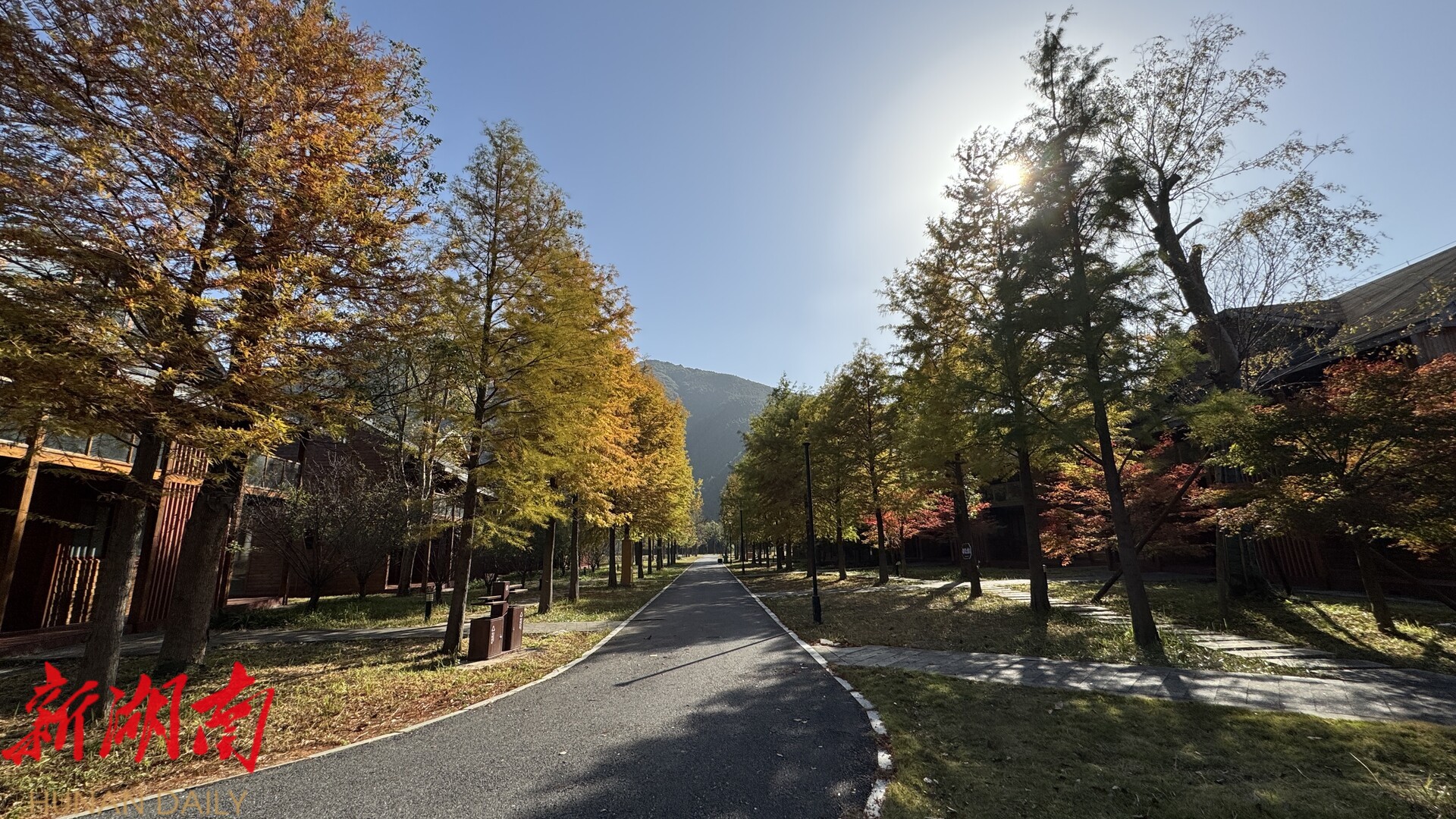 在连排的小木屋旁,一行行落羽杉构成了初冬的限定美景。金黄的叶片如羽毛般轻盈,与古朴木屋、瑶族风情建筑相映成趣,在光影交错间尽显冬日静谧之美。