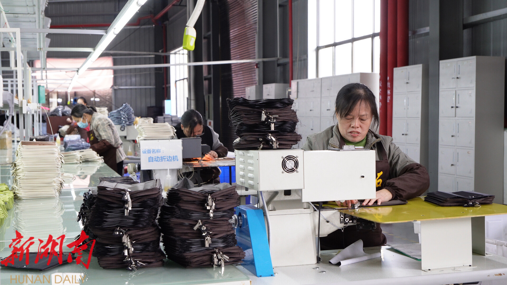 洞口县黄桥镇石捷包袋厂位于黄桥镇八亭丘易地搬迁安置小区旁,以前是“扶贫车间”,在当地政府的帮助下,逐渐转变为如今的乡村车间,目前主营包袋制造、销售等业务。走进车间,灯光明亮的工作区里,各色布艺收纳包堆成了小山,工人们的指尖在布料间翻飞——有的正将成品码放整齐,有的低头缝制细节,机器轻响与交谈声裹着暖意,织就出一幅“家门口就业”的忙碌图景。