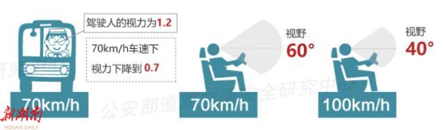 速度越快,反应时间越短,视野越小。实验表明,当时速70公里时,视力为1.2的驾驶人视力将会下降到0.7,同时,车速越快,视野范围越小。当时速40公里时,视野为100度,当时速70公里时,视野为60度,当时速100公里时,视野为40度。