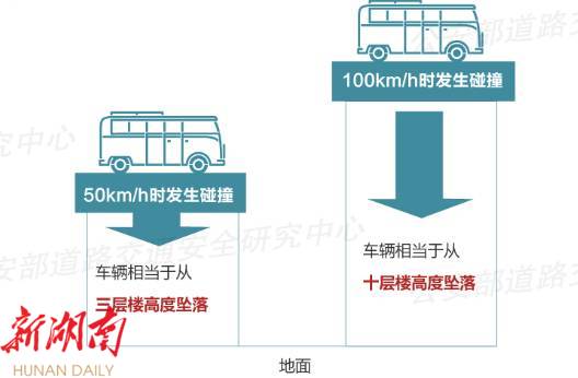车速越快,碰撞能量越大,车速增为两倍,碰撞能量增为四倍。如果时速为50公里,发生事故时,车辆相当于从三层楼高度坠落;如果时速为100公里,发生事故时,车辆相当于从十层楼的高度坠落。