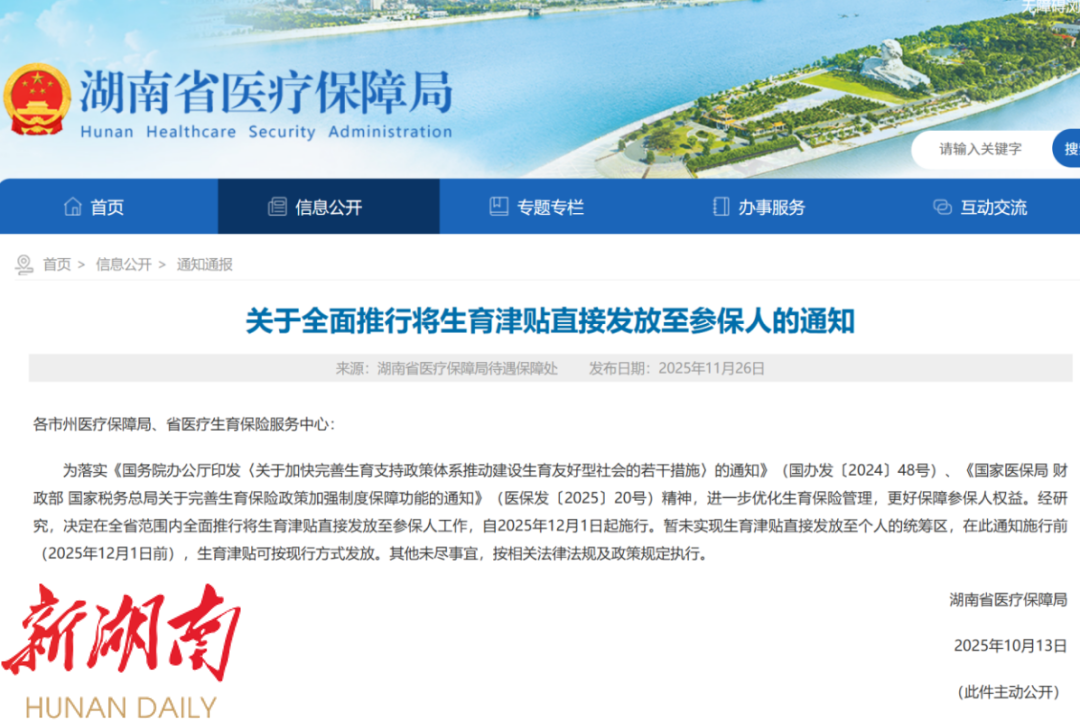 11月27日,记者从湖南省医保局获悉, 自12月1日起,湖南将在全省范围内全面推行生育津贴直接发放至参保人个人账户。 此举旨在落实国家生育支持政策,优化生育保险管理服务,进一步筑牢参保女职工生育权益保障防线。
