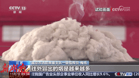 50多秒的时间,能明显看到棉絮内部往外冒出的烟越来越多,白烟逐渐变成了青烟。过去3分多钟,棉絮的内部正在进行持续阴燃蓄热,明显能看到棉絮表面由黄变黑。