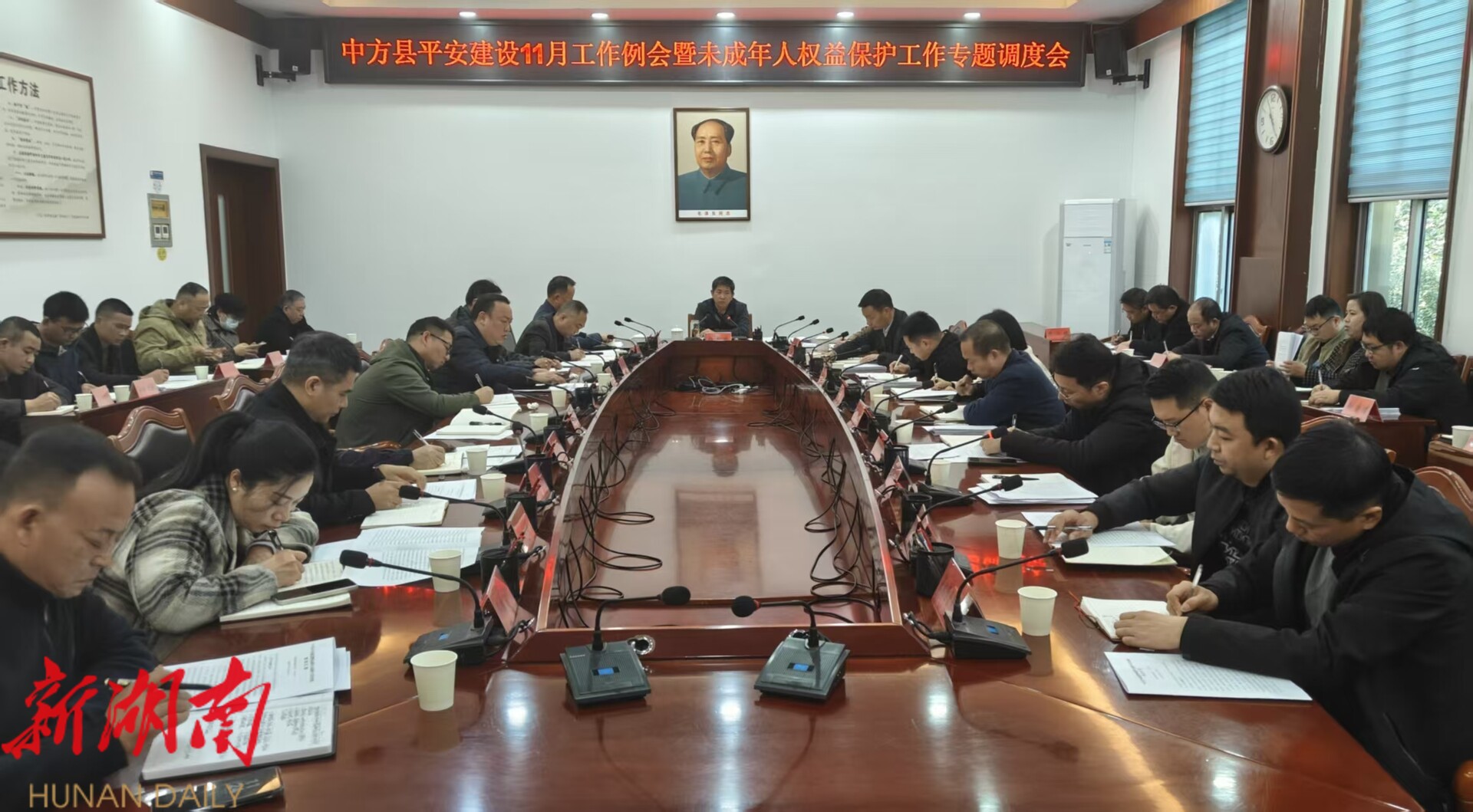 中方融媒11月28日讯 (记者:王子豪)11月28日,中方县平安建设11月工作例会暨未成年人权益保护工作专题调度会在县行政中心5号会议室召开,县委常委、政法委书记杨春斌,县领导黄翔、米久松及相关县直单位、乡镇负责人参加会议。