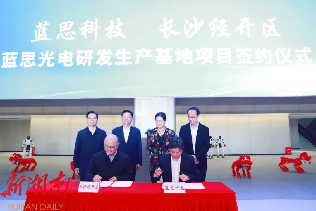 活动现场,蓝思光电研发生产基地项目正式签约。该项目主要布局生产检测设备、AI服务器、车用玻璃、太阳能光伏玻璃及核心零部件等高附加值板块,业务场景覆盖消费电子、新能源汽车、AI眼镜/XR头显等战略性新兴产业和未来产业领域,将助力蓝思科技向高端化、智能化转型,为长沙布局新赛道提供强有力支撑。