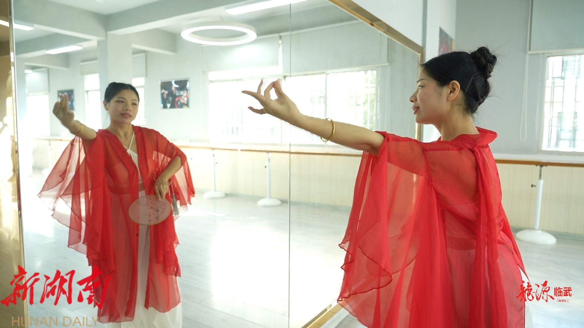 另一边的舞蹈教室,《新贵妃醉酒》旋律婉转,周悄悄正反复打磨每一个动作细节。作为一名传统文化爱好者,她不仅追求动作的精准,更致力于将舞蹈与传统文化相融合。为了更好地诠释“贵妃”的内心世界,她深入研习古代宫廷礼仪与服饰文化,还在表演中融入实景演绎与对话设计,通过眼神流转与肢体语言,细腻展现角色的情感起伏。
