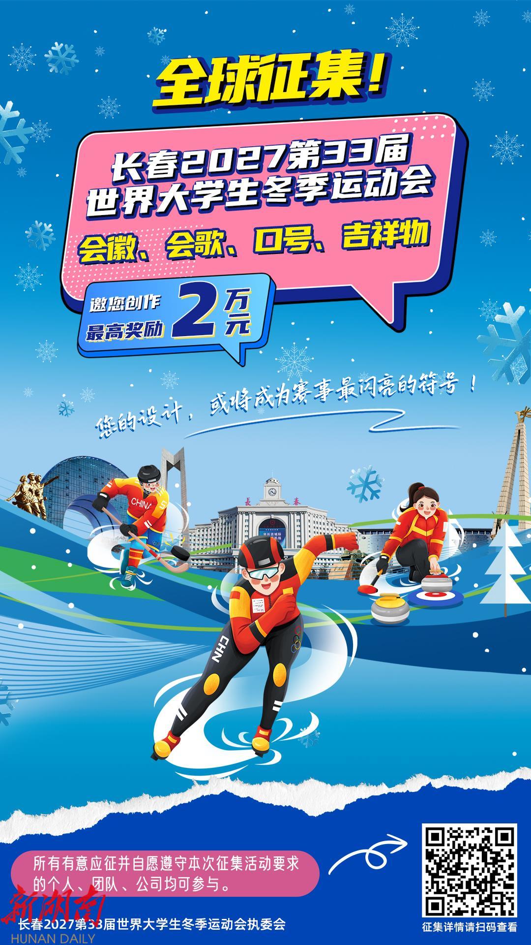 长春2027第33届世界大学生冬季运动会从11月28日起面向全球公开征集会徽、会歌、口号和吉祥物。