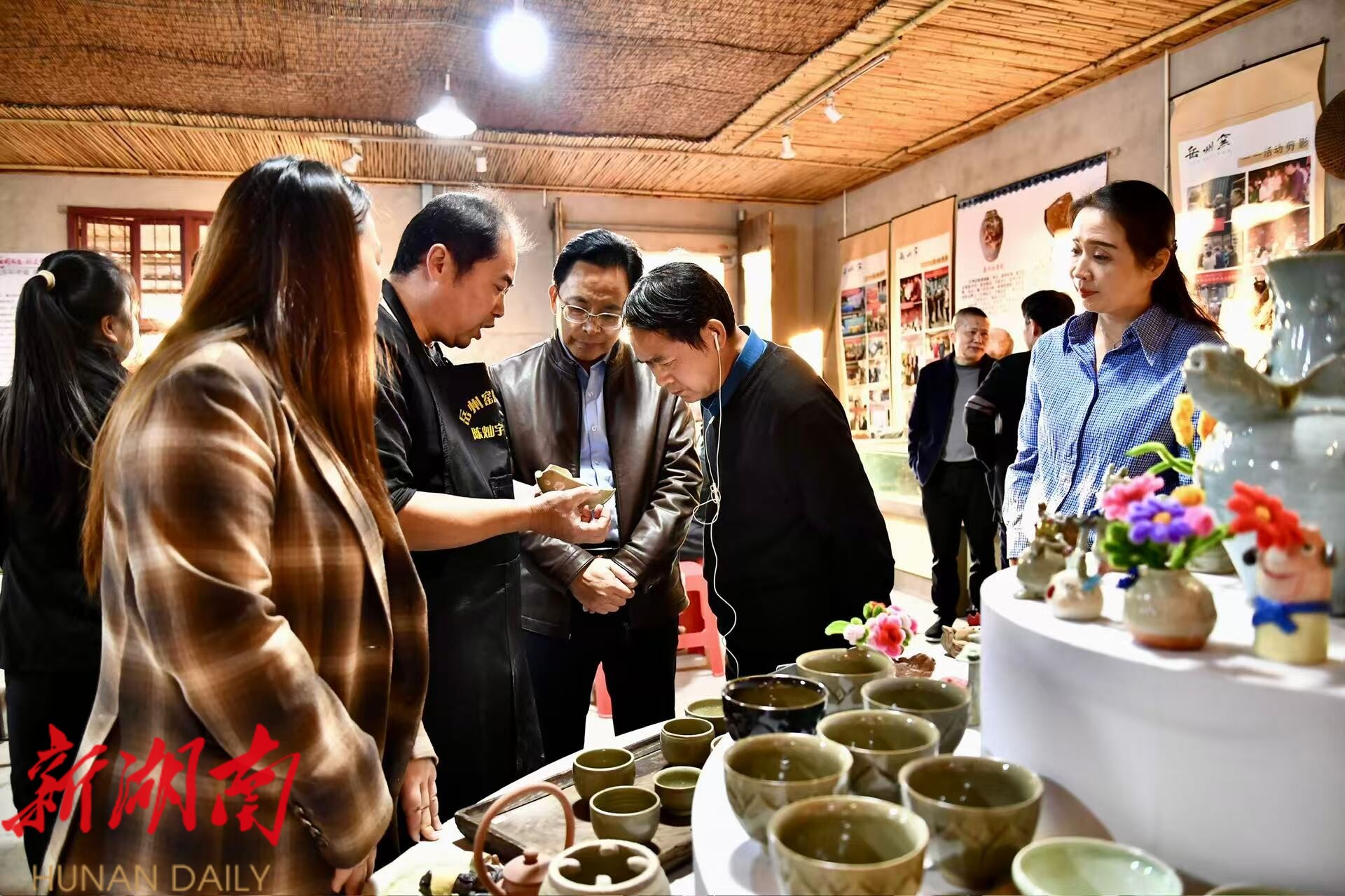 采风首站驻足文星街道三峰窑社区,岳州窑及社火非遗陈列馆内,承载着千年历史的古瓷温润含光,蕴含着古老民俗的社火展品意蕴厚重,静静流淌着绵长文脉的余韵;在张玉清同志故居前,青砖黛瓦间沉淀着革命岁月的峥嵘记忆,大家驻足追思,深切感念革命先辈的初心担当。