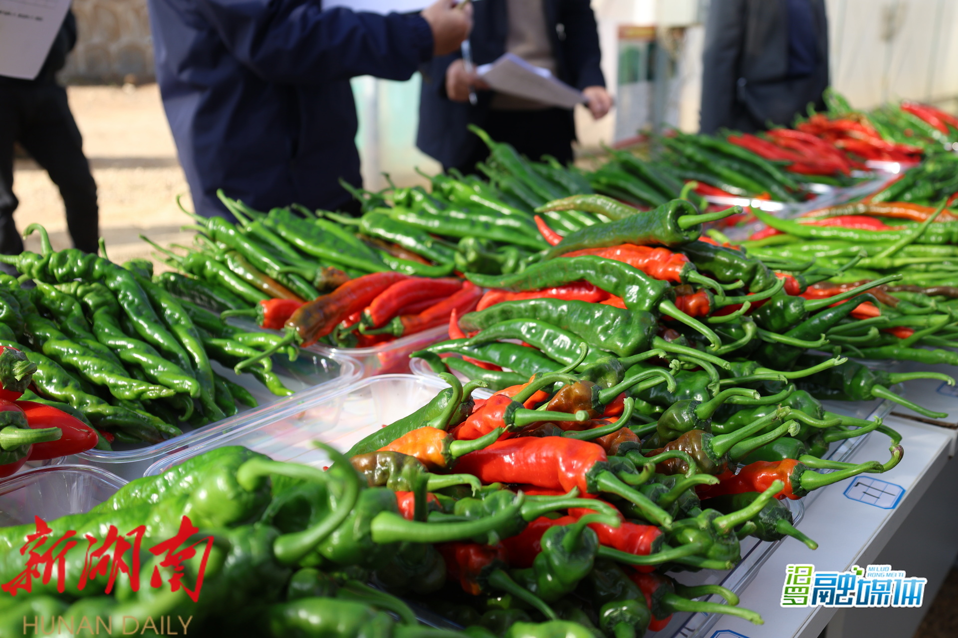 大棚内,专家团边走边记录各类辣椒、茄子 等秋延蔬菜的 长势、抗病性与适应性,亲口品尝,细细甄别辣椒的辣度等级与口感风味。经盲评打分与集中评议,最终确定 12 个主推品种:尖椒类兴 蔬 211、湘研 6750、湘研 2307、长研青香、臻香辣2号;螺丝椒类湘旋 601、皱辣 4 号;线椒类皱线 3 号、博辣湘龙;茄子 早红茄2号;番茄兴 蔬粉精灵;黄瓜 亮绿 2 号。这些品种在综合性状、适应性、产量或商品性 方面展现出了明显优势。