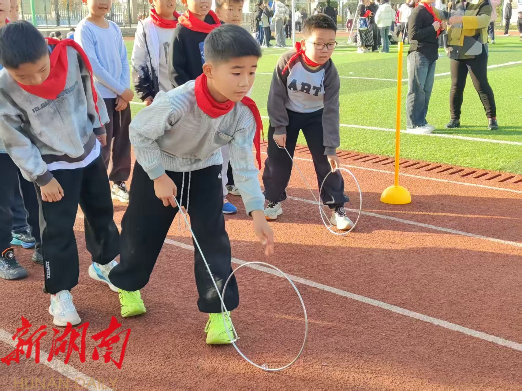 本次运动会分年级设置滚铁环、摸石头过河、拔河、四人五足、袋鼠跳接力、毛毛虫接力等多项趣味赛事。学生们在比赛中展现活力、彰显默契,现场掌声与欢呼声此起彼伏。赛后,学校对取得优异成绩的班级和个人进行了表彰。