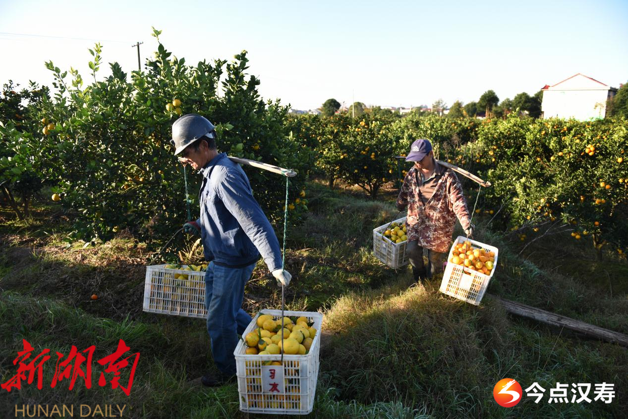 果园里,村民们正忙碌地采摘着成熟的糖橙,肩挑满筐的果实在林间穿梭,采摘、搬运、分拣、装袋等环节井然有序,展现着村民们默契的协作精神。额间的汗珠、掌心的老茧,与脸上洋溢的幸福笑容,共同诉说着劳动的光荣与收获的喜悦。