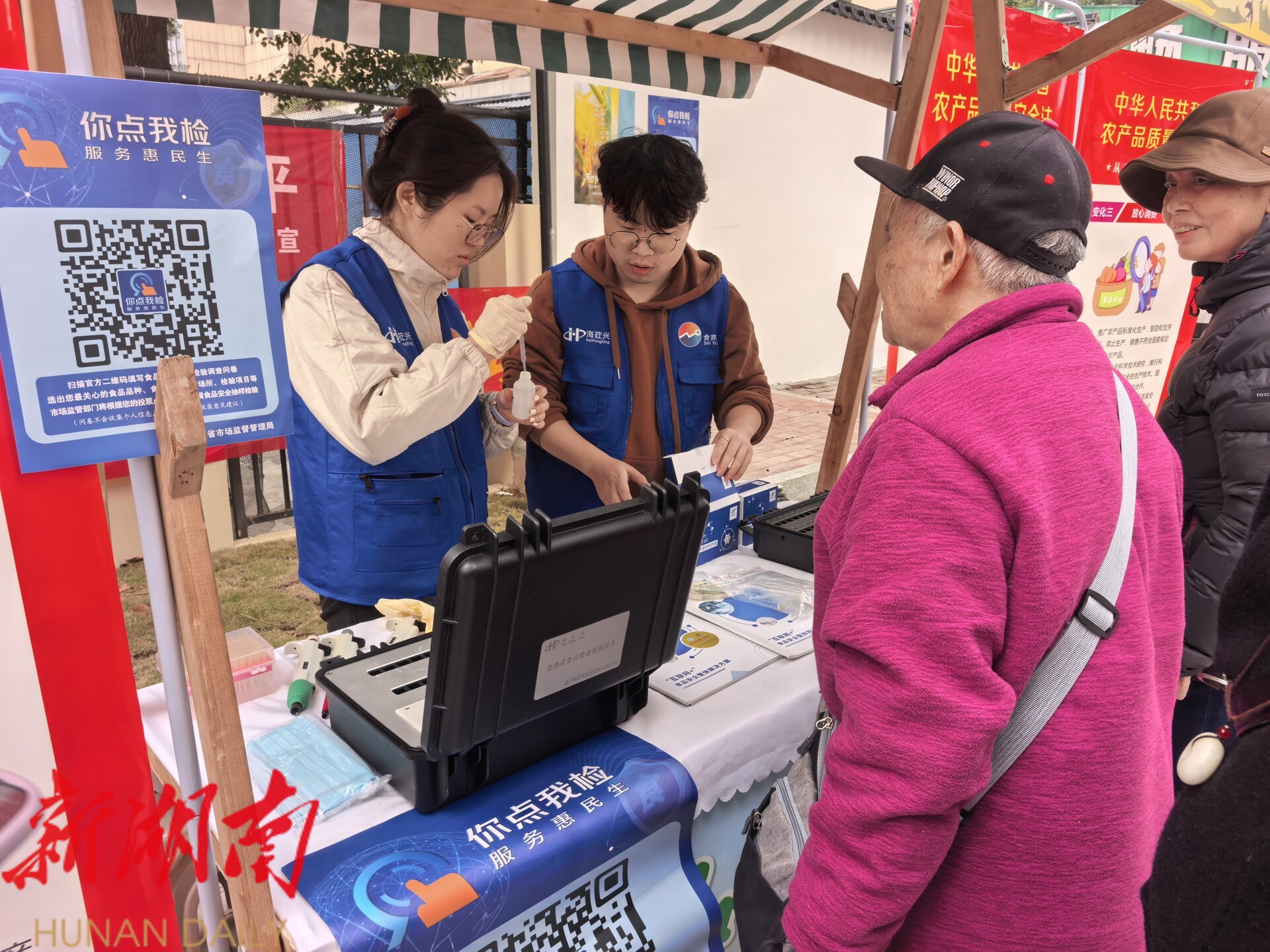活动现场设立农产品质量安全宣传专区,通过发放宣传册、开展法规讲解,向居民普及选购知识与相关法律。趣味十足的“农安知识”有奖问答吸引众多居民参与,在互动中提升食品安全意识。“你点我检”快速检测服务台为居民提供现场农产品检测,让安全看得见、摸得着。