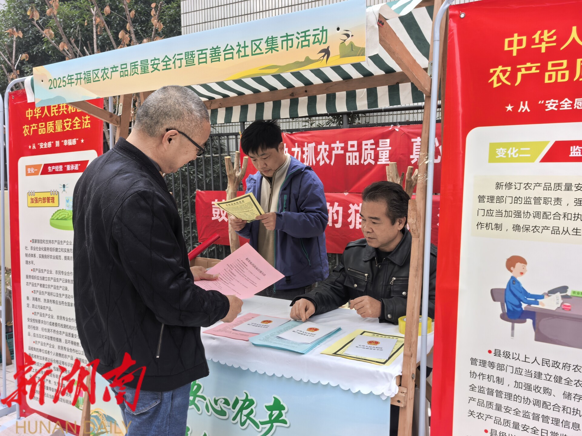 湖南日报·新湖南客户端12月2日讯(通讯员 任萱)为切实保障居民“舌尖上的安全”,弘扬“善文化”邻里新风,搭建惠民生、暖民心的社区互动平台,12月2日上午,由开福区人大农业与农村委员会、区农业农村局、区市场监督管理局指导,湘雅路街道办事处主办,百善台社区承办的“品安心农产 聚善邻温情”2025年开福区农产品质量安全行暨百善台社区集市活动顺利举行。活动联动辖区单位、党员群众及志愿者,围绕“农产品安全科普、便民服务推广、邻里互动共享”三大主题展开,致力于打造安全、温馨、和谐的社区生活共同体。