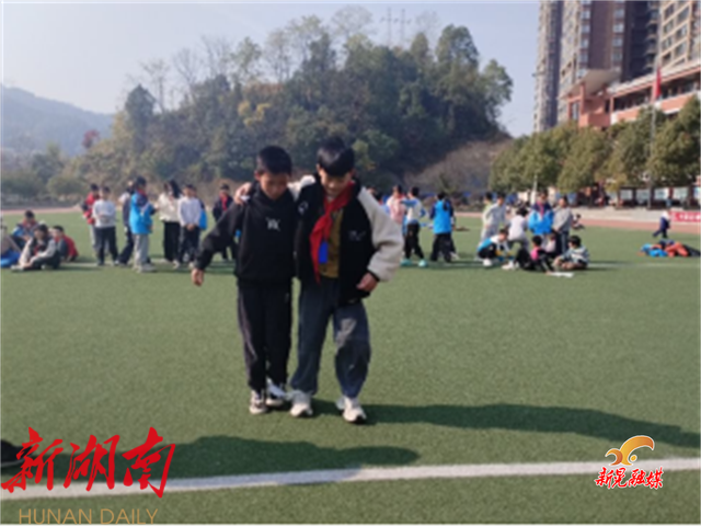 活动以趣味 “听令行动” 拉开序幕。同学们手拉手围圈,跟着老师口令互动,挑战“口令心非”,大家在轻松氛围中锻炼了反应能力,也感受到包容的温暖。在随后的“两人三足”友谊赛现场,同学们抽签分组,两人绑腿并肩前行,齐声喊着 “一二、一二” 的口号。有的小组步伐协调,快速冲线;有的虽摇摇晃晃却始终携手不放,与同伴坚持前行。