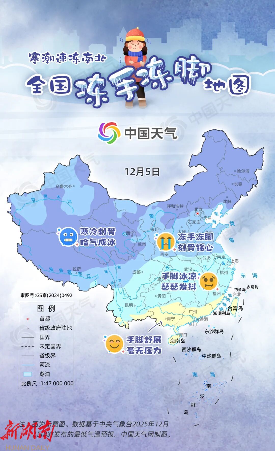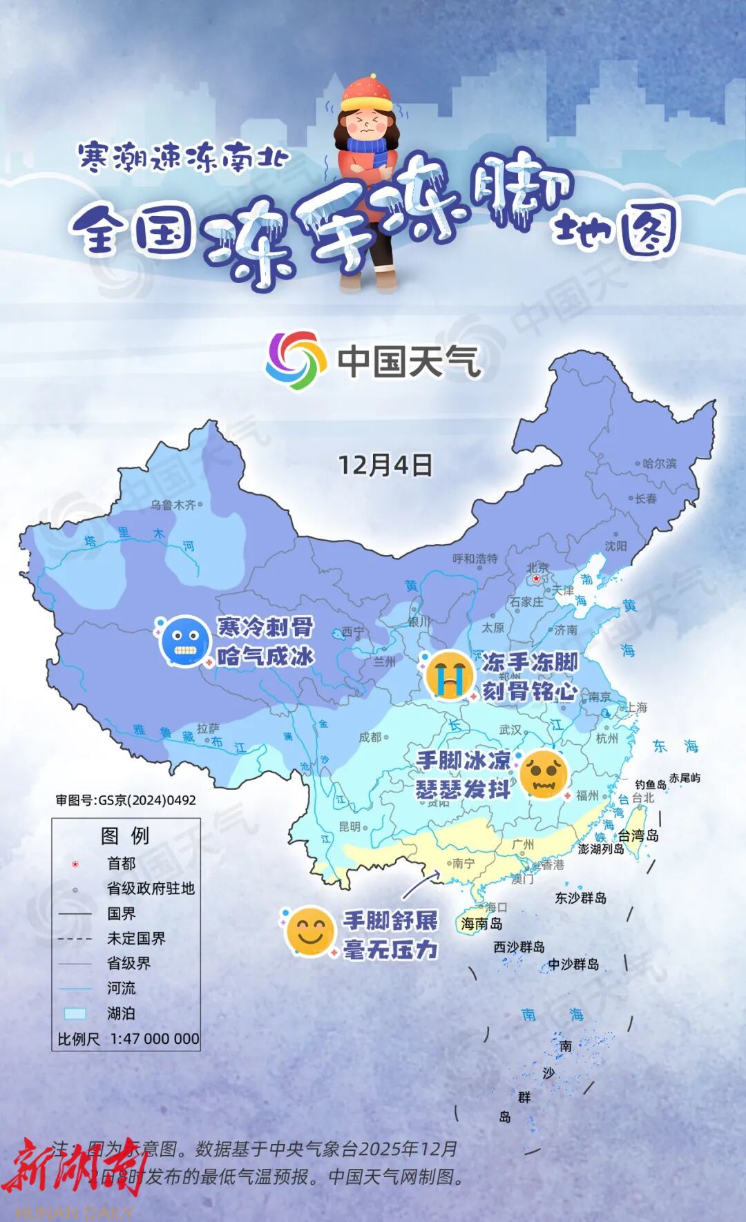 4日早晨,最低温度0℃线将南压至浙江中南部、安徽南部、湖北北部一带,也是本次寒潮过程中抵达的最南端。全国约一半国土都将处于“寒冷刺骨”或“冻手冻脚”的区域中,体验极致“冻”感。大城市中,南京最低气温或是下半年来首次跌至冰点附近,合肥甚至可能跌破冰点。此外,“手脚冰凉”的区域最南端也可抵达华南北部一带,提醒当地的小伙伴早晨外出要多添一件外套,避免瑟瑟发抖。同时,“手脚舒展”区域将向南收缩到云南南部和华南等地,上述地区的小伙伴早起出门毫无压力,体感舒适。