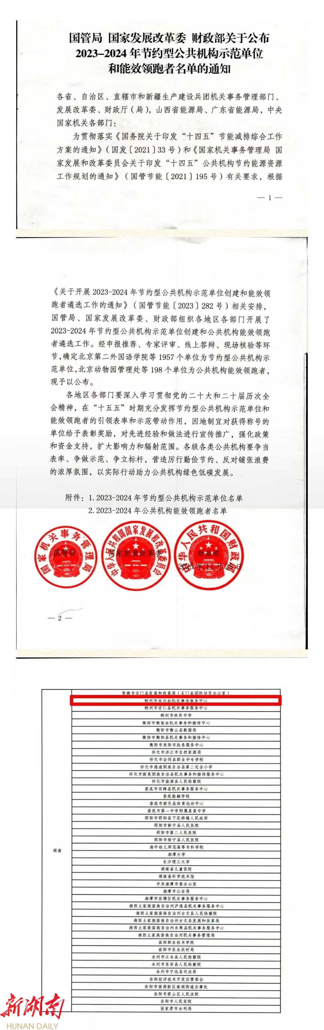 湖南日报·新湖南客户端12月3日讯 近日,国家机关事务管理局、国家发展和改革委员会、财政部联合公布了2023—2024年度节约型公共机构示范单位和能效领跑者名单。永兴县机关事务服务中心成功获评全国“节约型公共机构示范单位”,成为全县公共机构节能工作的典型代表和先行样板。
