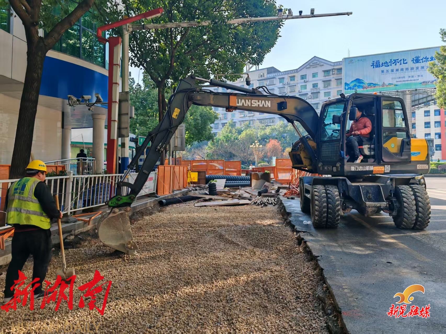 在砂洲路施工路段,围挡内的主干管道已经全部铺设完毕,部分场地已经完成了回填,工人们正配合着挖土机进行着路面砂石摊铺工作。后续还将进行沥青层摊铺、路面硬化、绿化景观恢复等收尾工作。