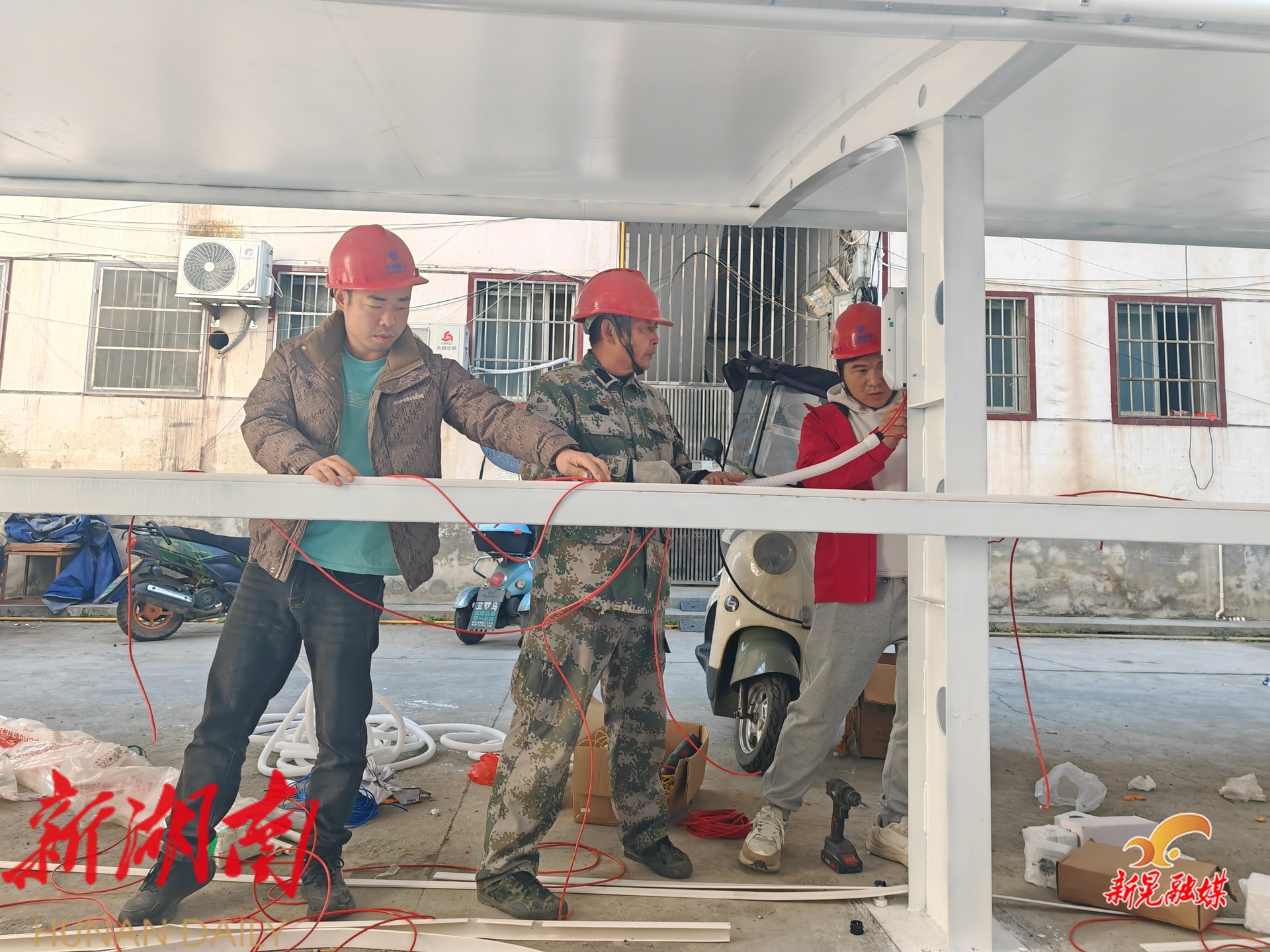 在环卫所宿舍施工现场,崭新的白色充电棚已然立起,工人们正有序安装充电插座以及智能控制器,并进行规范的线路铺设,使用充电钻将零线、火线接入智能控制器。