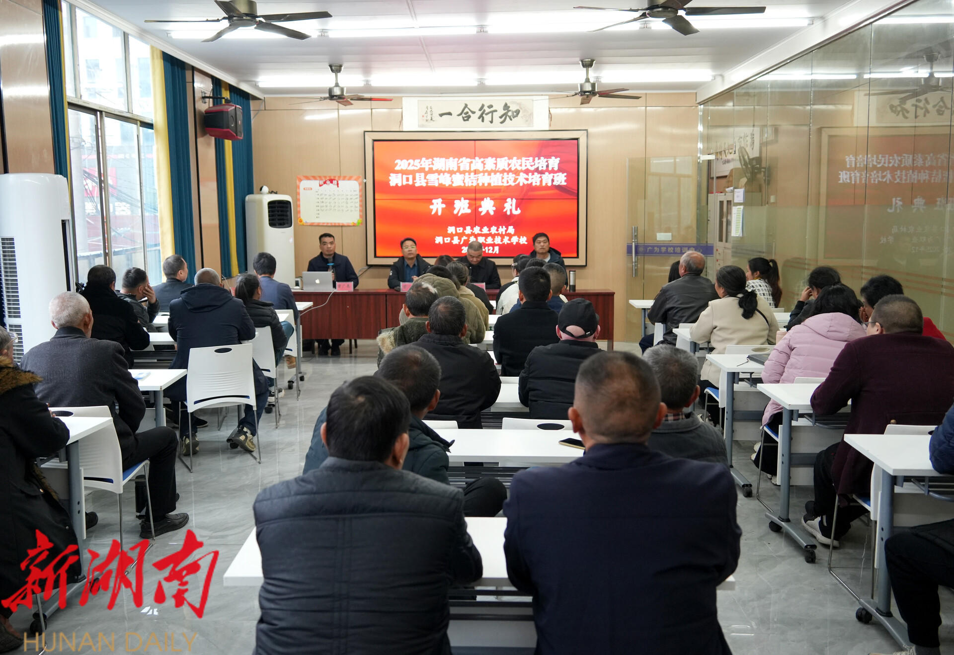 洞口融媒12月3日讯(记者:肖皓静 林巍浩) 12月3日,由洞口县农业农村局主办、洞口县广为职业技术学校承办的2025年湖南省高素质农民培育洞口县雪峰蜜桔种植技术培育班开班,来自全县各乡镇(街道、管理区)的50名学员参加培训。
