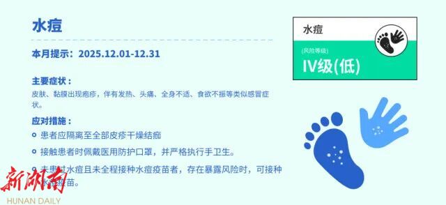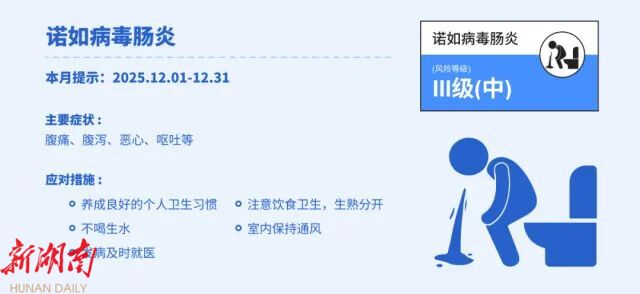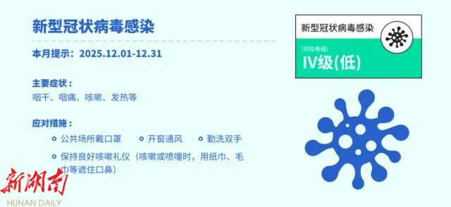 与此同时,诺如病毒肠炎风险维持中等水平,水痘与新冠病毒感染风险相对较低。湖南疾控提醒公众,当前正值流感高发季节,务必做好流感疫苗接种和日常个人防护,特别关注老人、儿童等易感人群,共同应对冬季传染病挑战。