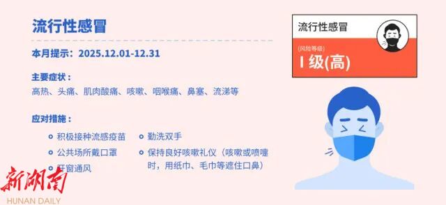 12月2日,湖南省疾病预防控制中心发布2025年12月疾病风险综合预报,本月全省防疫指数为Ⅲ级(中),但流行性感冒风险已攀升至最高级别(Ⅰ级),呈现高发态势。