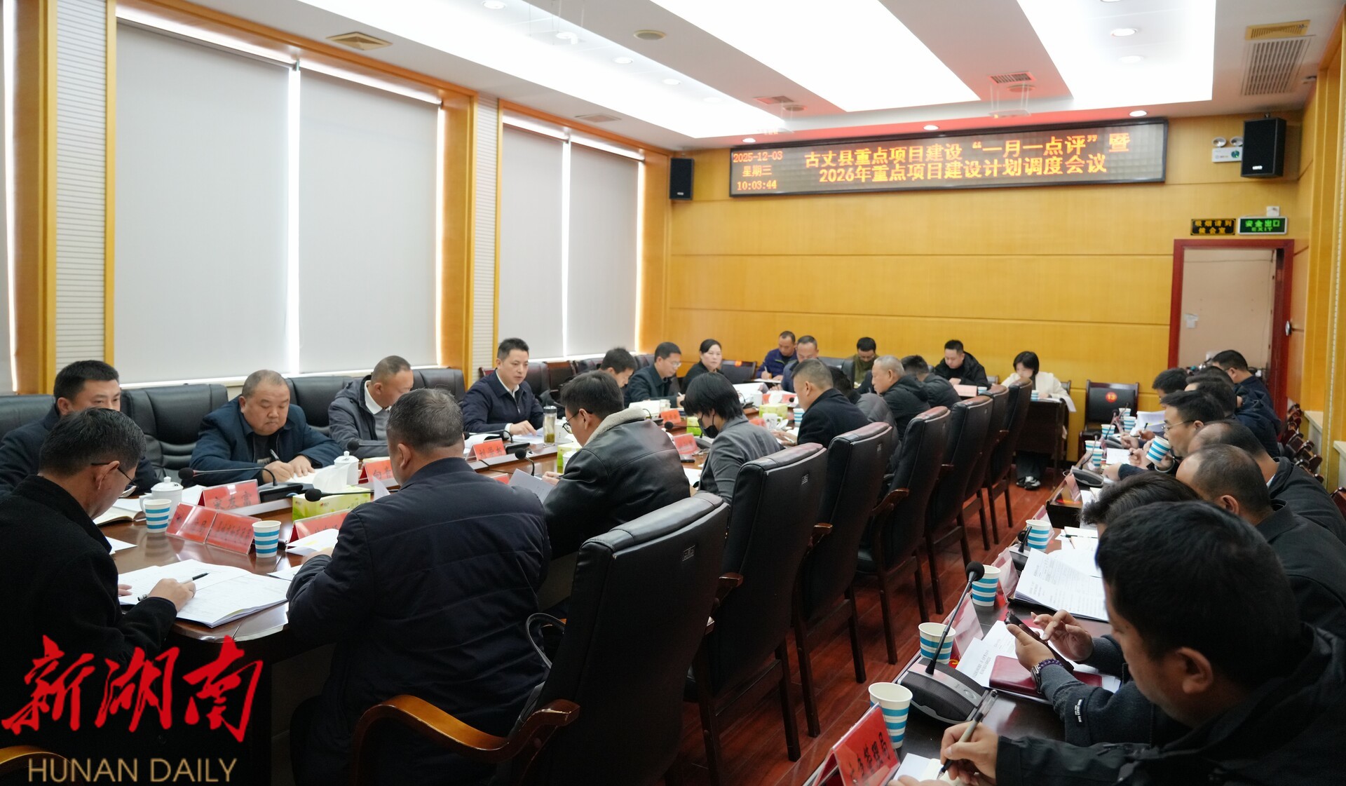 新湖南客户端12月3日讯(通讯员 郑湘 杨秀知)12月3日,湘西土家族苗族自治州古丈县委书记滕朝辉主持召开12月份全县重点项目建设“一月一点评”暨2026年重点项目建设计划调度会议,分析项目推进情况,协调解决存在问题,安排部署下一步工作。他强调,要牢固树立“项目为王”理念,以“时不我待、只争朝夕”的紧迫感,全力以赴推进项目建设,集中精力抓好项目谋划,为完成年度目标任务、实现明年良好开局奠定坚实基础,持续赋能古丈高质量发展。