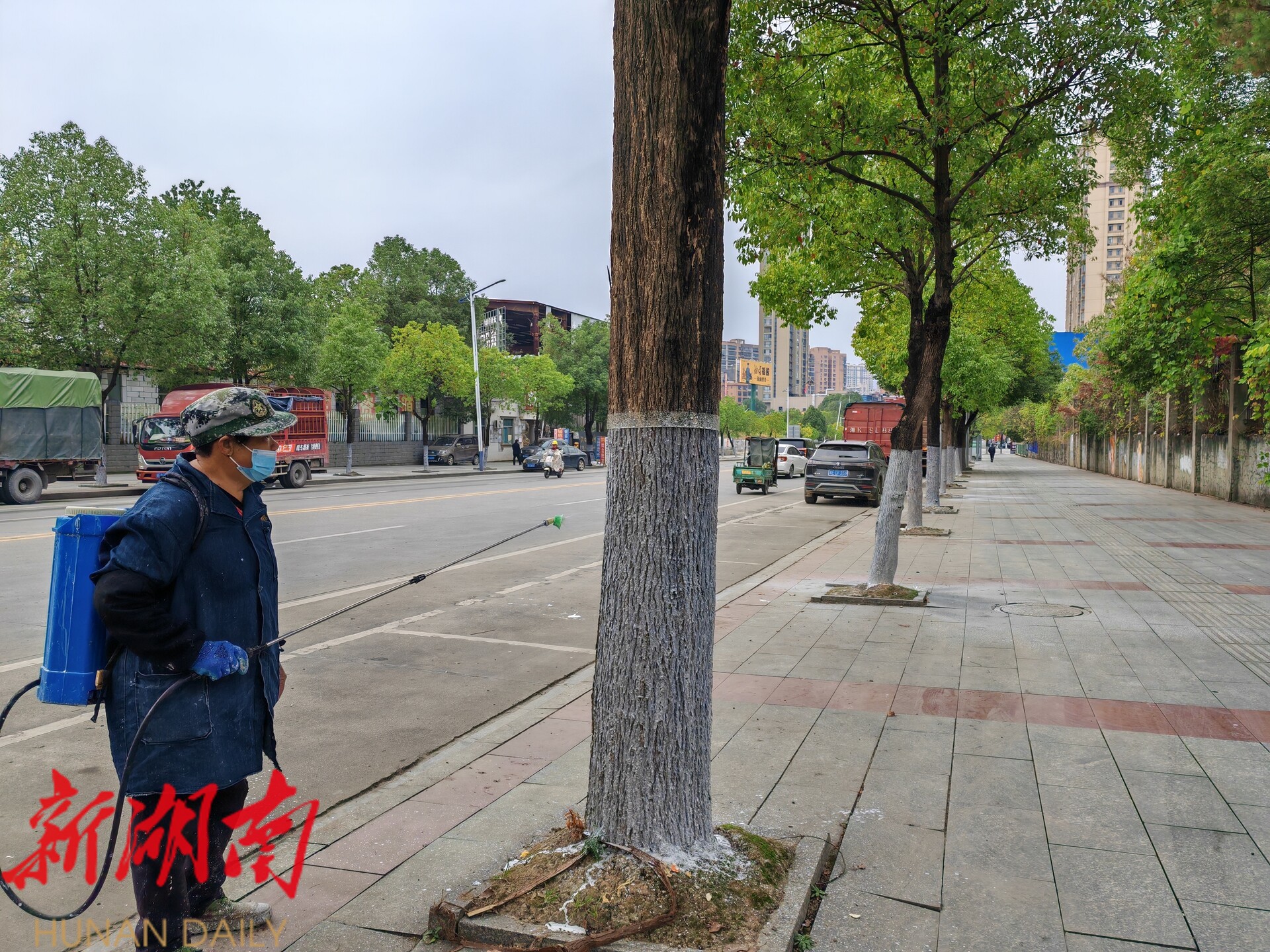洞口融媒12月4日讯(记者:胡涛) 12月4日,在洞口县梨园路主干道上,绿化养护人员正有条不紊地为道路两侧的树木实施“刷白”作业。工人们手持喷雾设备,以胶带为基准线,将配制好的涂白剂均匀喷涂在树干上。现场分工明确、配合默契,经过喷刷的树木整齐划一、洁白美观,成为冬日街边一道清新风景。