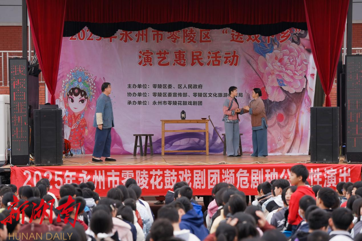 湖南日报·新湖南客户端12月5日(通讯员 龙小刚 秦红艳 张伍伦)12月3日,“传承戏曲经典,点亮青春校园”濒危剧种公益性演出暨零陵花鼓戏“非物质文化遗产进校园”活动在永州一中朝阳学校举行。活动通过剧目展演、知识讲解与互动体验相结合的方式,让七年级师生沉浸式感受传统戏曲艺术的魅力,在校园内营造了浓厚的文化传承氛围。