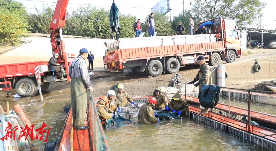 起鱼现场,20多名工人正在网箱中有序忙碌,一条条活蹦乱跳的鳙鱼、白鲢等大鱼随着收网不断跃出水面。工人们采用专业工具和设备,将鱼运送到岸边网箱后分拣上车,部分个体小的鱼则当作还湖苗种继续放回湖中。在岸边码头,带有称量设备的吊车将一筐筐肥硕的鲜鱼吊到保鲜鱼罐车上,随即运送到广州、武汉、成都等地的市场。