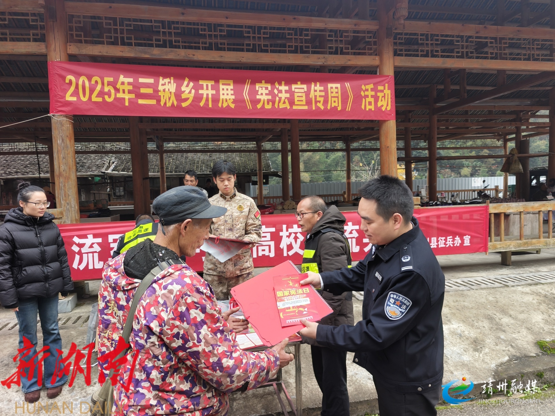 靖州融媒12月5日讯 (通讯员 龙文才)12月5日,靖州苗族侗族自治县三锹乡司法所紧扣“学习宣传贯彻习近平法治思想,推动宪法深入人心”主题,在集市设立“普法小摊”,开展宪法宣传周活动。