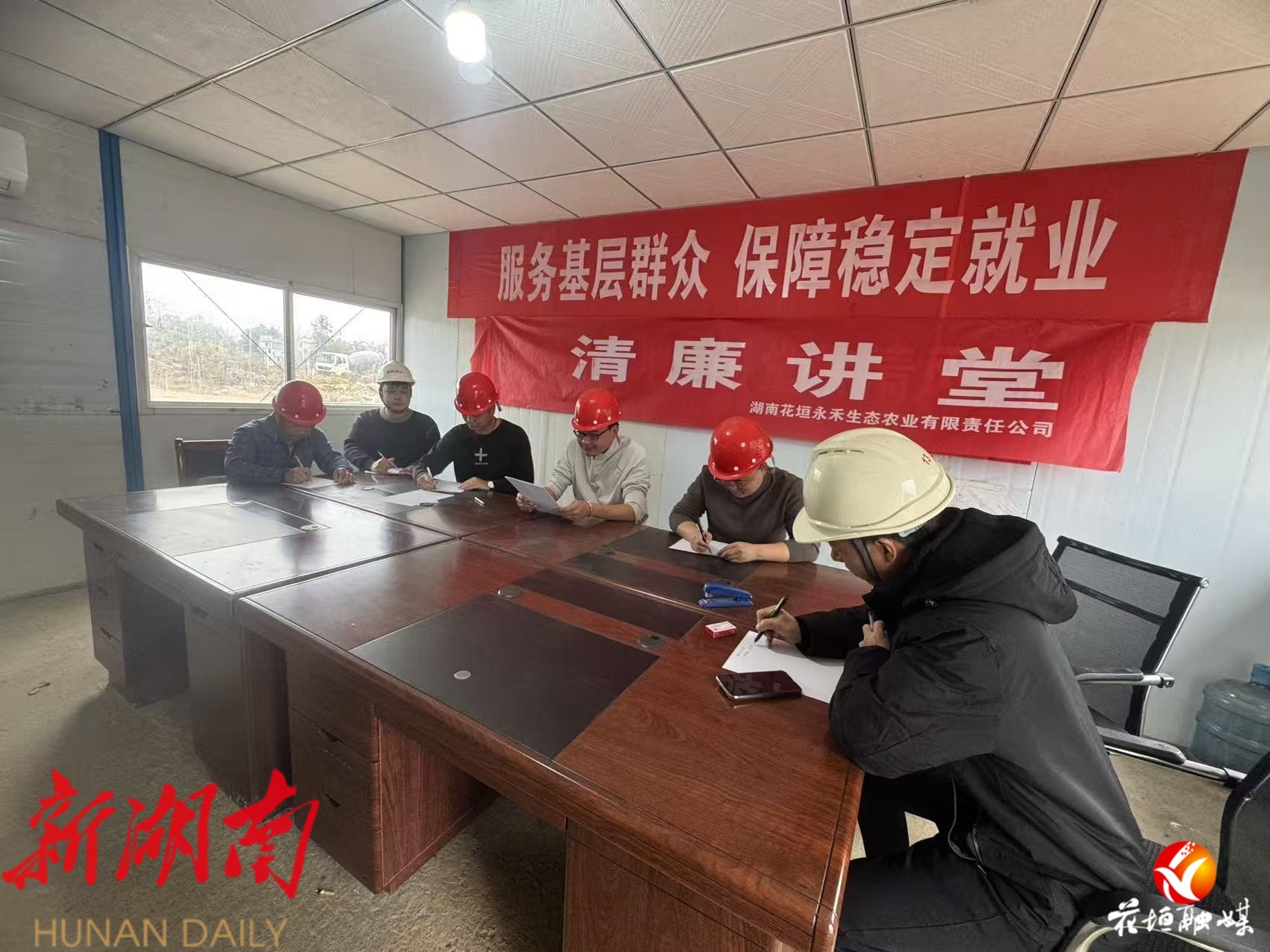 湖南日报·新湖南客户端12月6日讯(通讯员 吴志刚)12月3日,花垣永禾生态农业有限责任公司在花垣县国家农村产业融合发展示范园建设项目——农产品烘干仓储中心施工现场,开展“清廉讲堂进工地”活动。项目部全体管理人员、施工单位骨干、监理人员及关键岗位人员共同参加,接受廉洁从业教育。