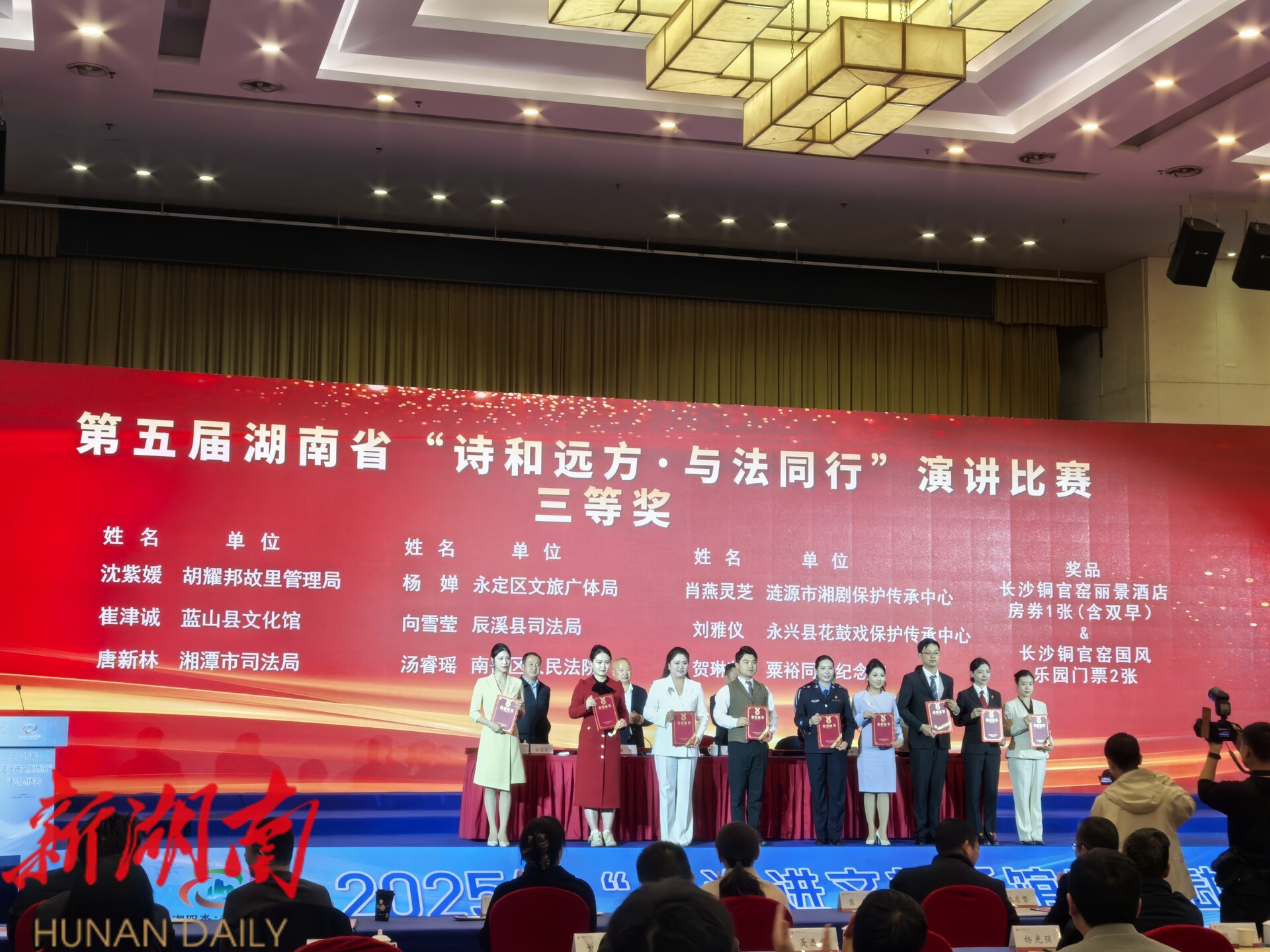 湖南日报·新湖南客户端12月8日讯(通讯员 李云香 )12月5日,2025年“法治进文旅场馆”活动总结会暨第五届湖南省“诗和远方·与法同行”演讲比赛决赛,在娄底市华天大酒店圆满落幕。经全省各市州层层选拔,28名优秀选手晋级决赛,永兴县文旅广体局选送选手与单位凭借硬实力斩获两项荣誉,成为县级文旅系统中的亮眼代表。