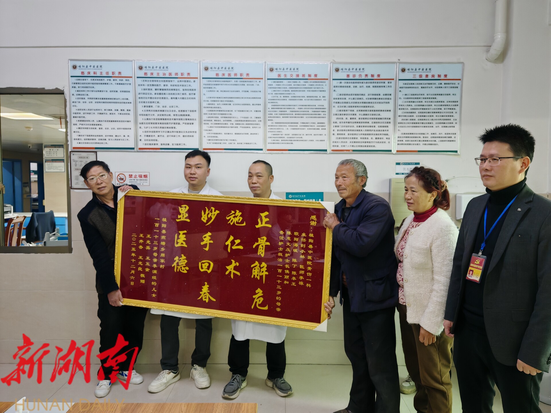 新桂阳12月8日讯(记者 周立志)12月5日,病人家属把印有“正骨解危施仁术 妙手回春显医德”的牌匾送到县中医医院骨伤一科感谢医生为他们的百岁母亲治愈病痛,让老人能够重新站立行走。