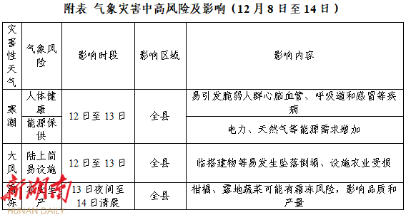 2、防范寒潮大风对能源保供、人体健康、水陆交通、户外设施、农业生产、城市安全运行等的影响。建议提前做好户外设施防风加固,敏感人群注意增添衣物,防范流感、呼吸道及心脑血管等疾病,注意取暖用火用电用气安全,柑橘、露地蔬菜等农作物做好防霜冻措施。防范高海拔山区冰冻对交通、电力、通讯线路等设施的不利影响。