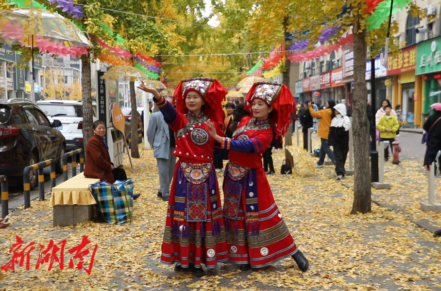 走进该路段,连片的银杏树仿佛披上了“黄金甲”,阳光透过枝叶洒下,地面上落满了金黄的叶片,踩上去沙沙作响,随手一拍都是绝美的风景。市民带着孩子玩耍拍照、不少情侣在银杏树下拍照打卡。身着特色瑶族服装的阿妹们在银杏树下起舞,展现出浓郁的民族风情。